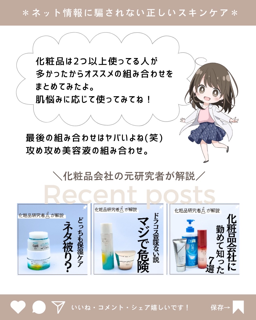 特定の有効成分を試してみたい。美容成分を試したい。そんな時は代用してもいいけど、それって似てるのかな?って思うときが正直ある。 同じ成分があっても実は濃度が違ったり、処方技術が違ったり。技術が違うと使用感も剤型も変わることがあることは知ったうえで使うといいかも。 せっかくプチプラ化粧品を買うならそれはそれで楽しんでほしいから是非念頭にいれてほしいな!!