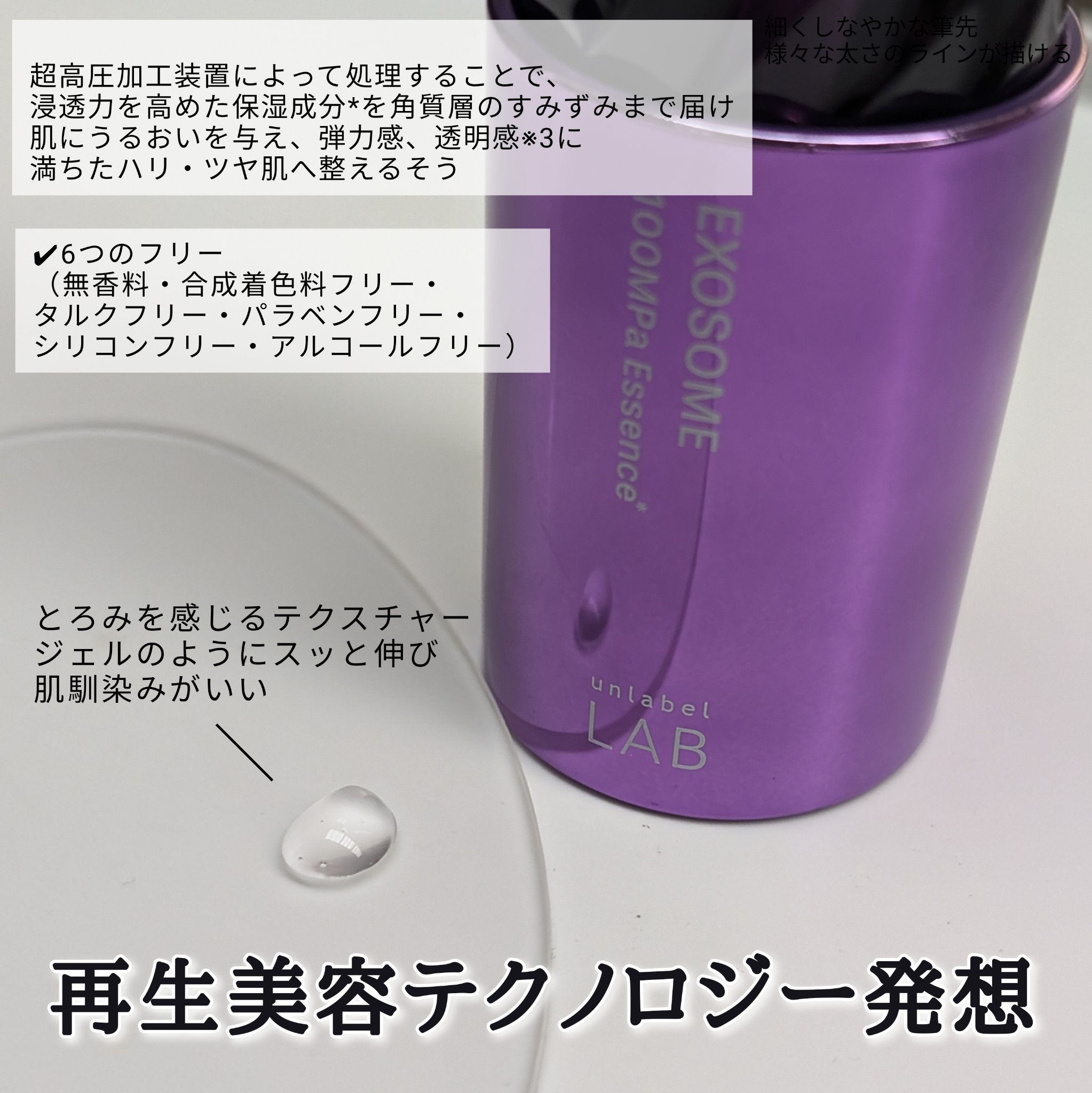年齢肌の気になる悩みにアプローチする再生美容テクノロジー発想の超高圧浸透型エクソソーム*配合美容液。 角質層のすみずみまでうるおいを届け、いきいきとしたハリツヤ肌へ整えてくれます。 無香料・合成着色料フリー・タルクフリー・パラベンフリー・シリコンフリー・アルコールフリー。