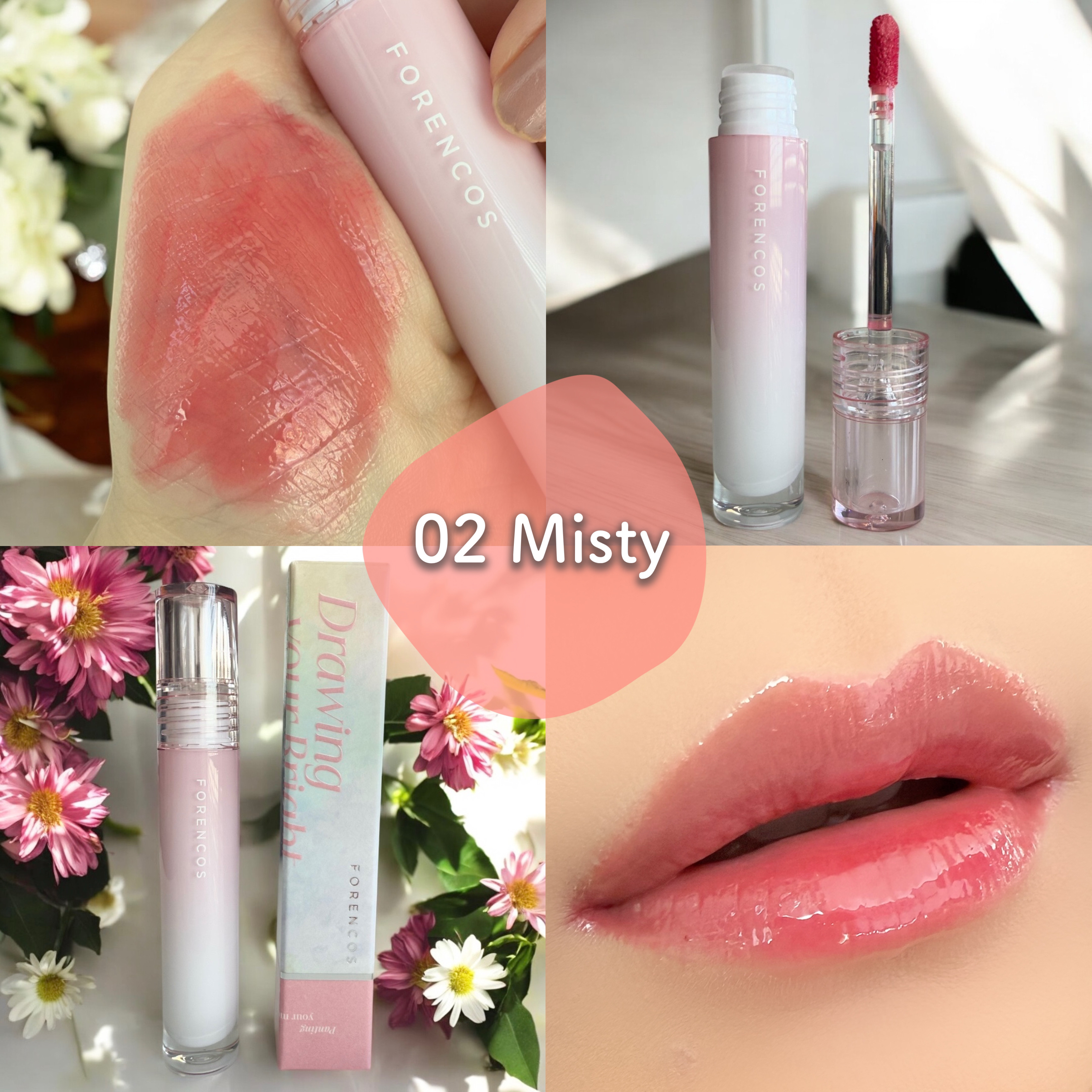 透き通る色彩とちゅるんとした水光ツヤがかわいいフォレンコスのティント♡ 重たさを感じないみずみずしいテクスチャーだけど、唇に馴染ませるとしっかり密着。 02 Misty はまさに美少女カラー めっっっちゃかわいいこの色…!