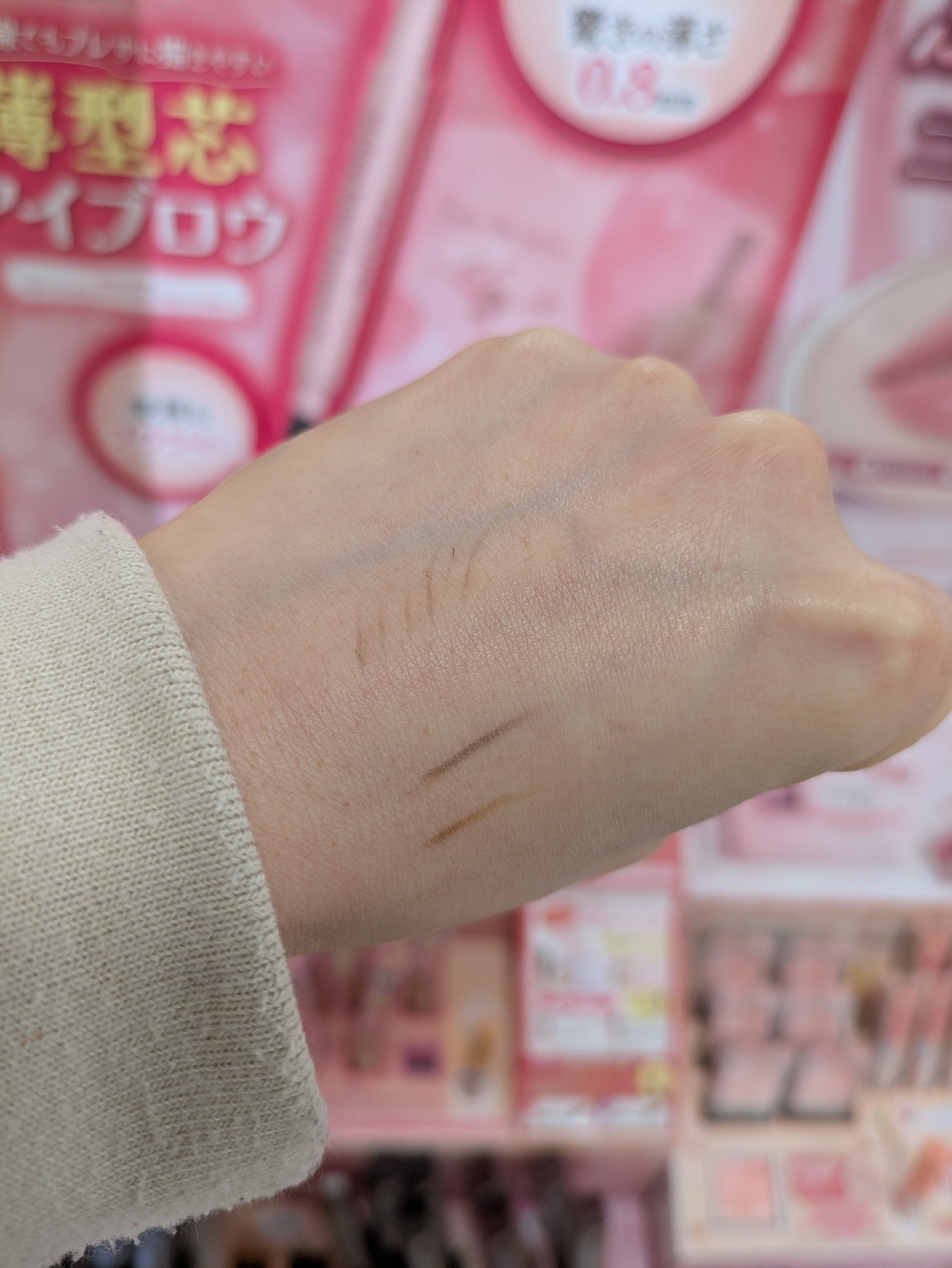 形がチョコレートの板にしか見えないぐらい四角アイブロウ。えんぴつをそういう削り方をするのは見たことありますが、プラスティック容器に入った支え形では見たことがないです。 01ナチュラルブラウン 見た感じはチョコレートのような色。書いてみると、薄つきで少し明るめブラウンです。 プチプラながらも、逆側にキャップ付きのスクリューブラシもついて◎。