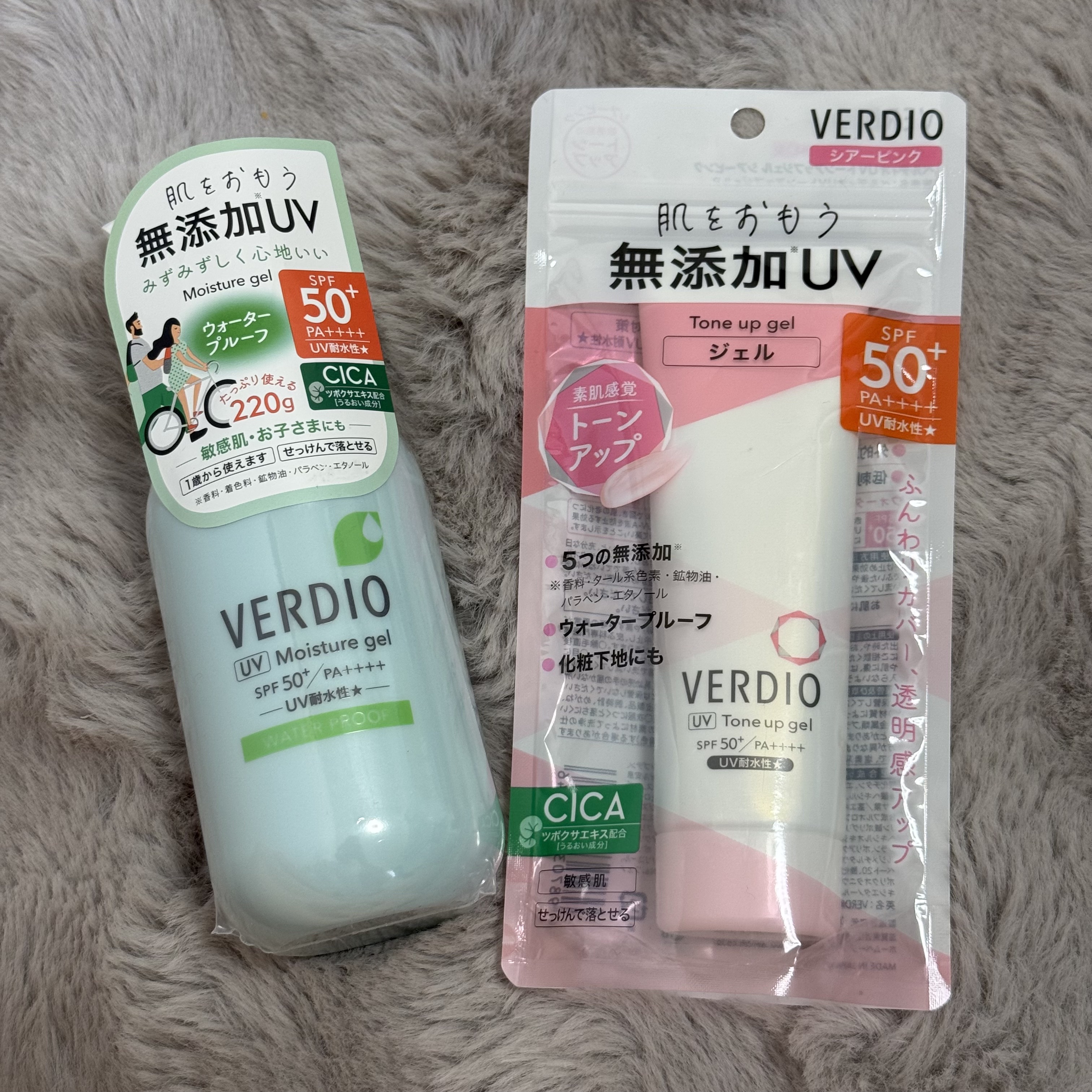 .近江兄弟社さまからいただきました🍃★ベルディオ UVモイスチャージェルN UVトーンアップジェルシアーピンクどちらも伸びのいいジェルタイプ!みずみずしいテクスチャーでべたつかない。低刺激処方が嬉しい😊大容量のポンプは子どもと一緒に使おうと思...