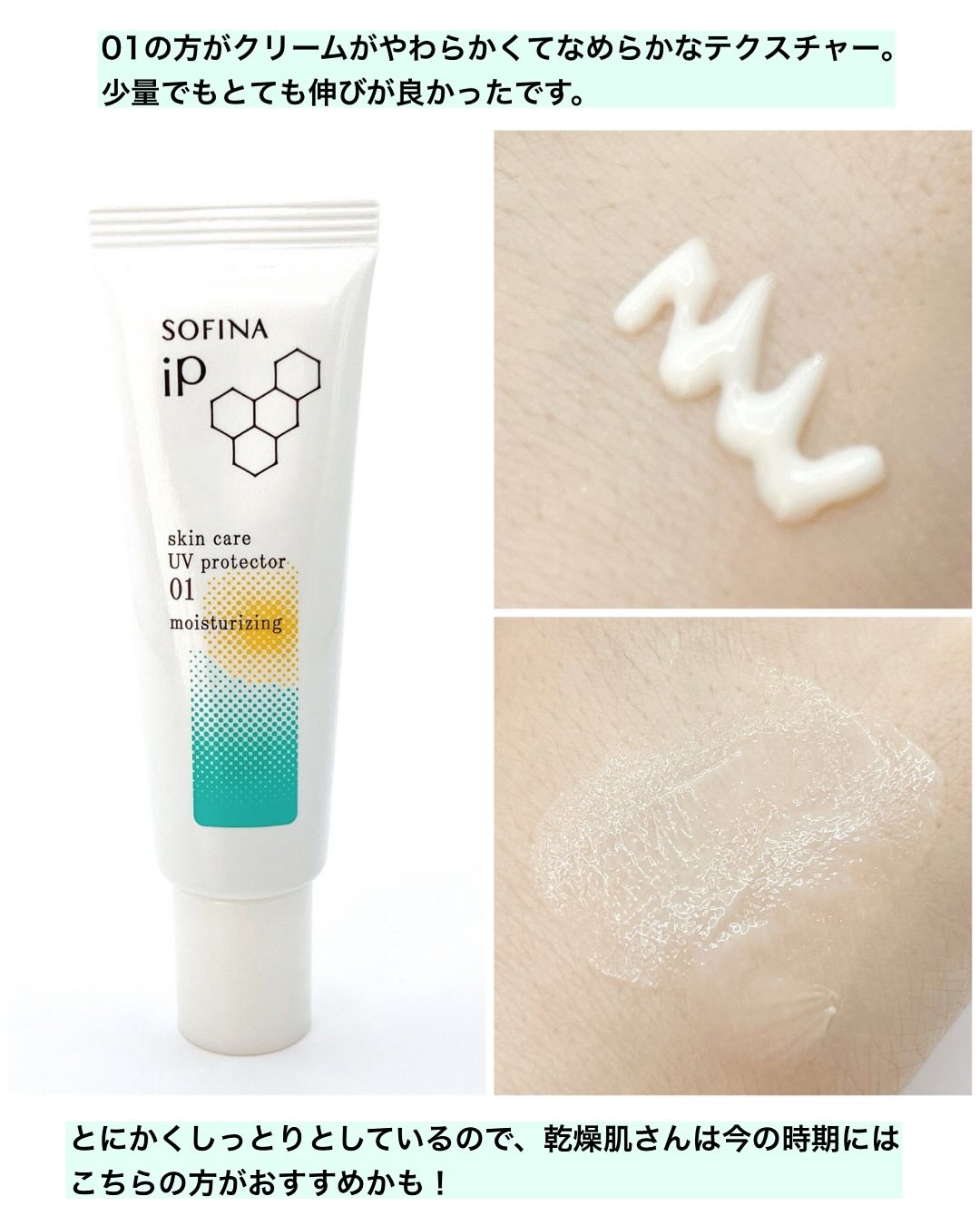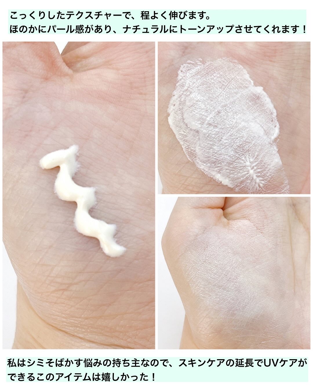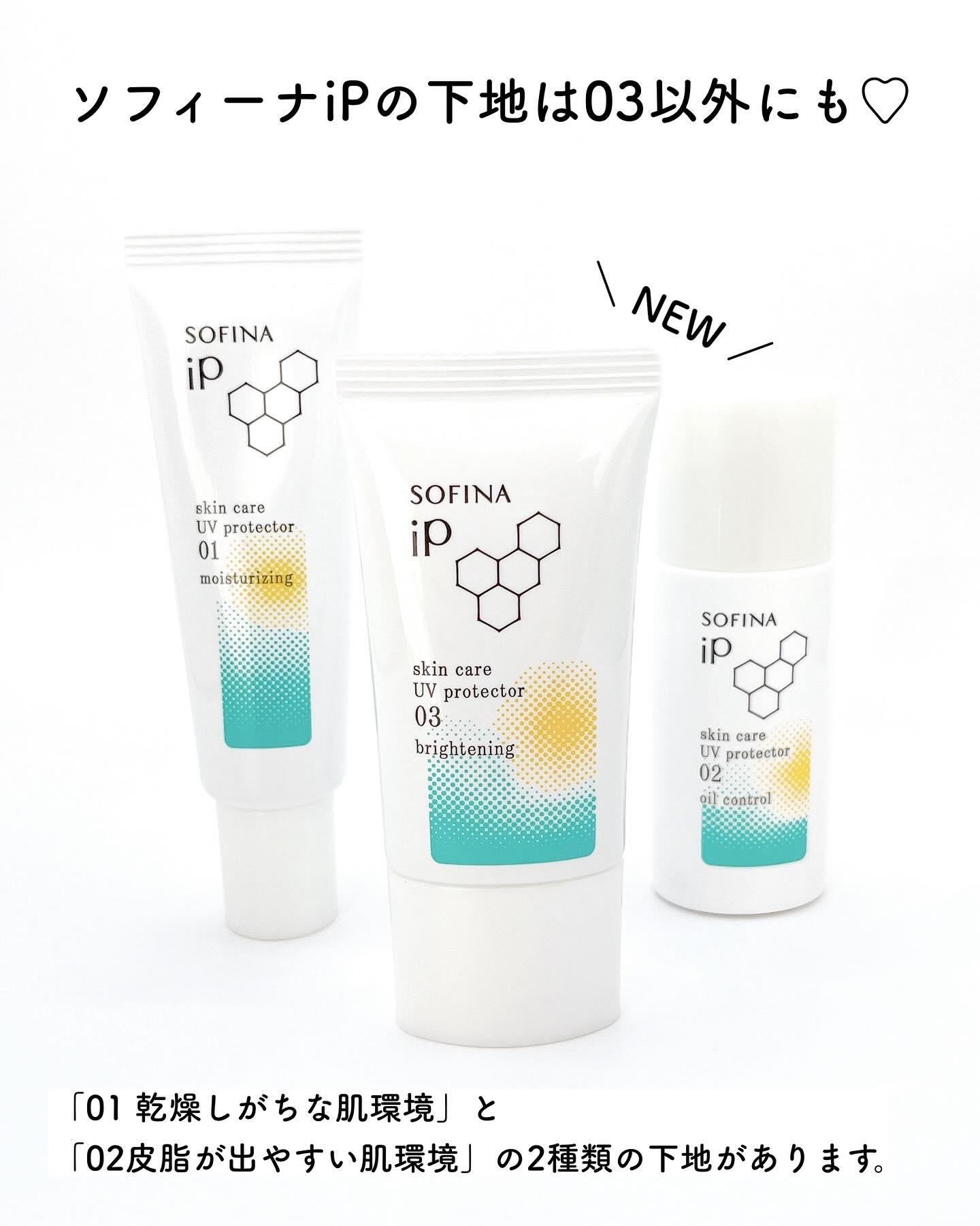 3種の肌環境で選べるスキンケアUV☀️ 01は水分補給UV、02はオイルコントロールUV、03はシミ予防UVになってるよ! 私のお気に入りは、03💚 有効成分カモミラETを配合。 乾燥してくすんだ肌に潤いを与えて、塗ったそばから均一でつややかな状態に導いてくれる🫶 塗布後の肌の肌全体が透明感のある自然な明るい仕上がりで美肌感を上げてくれるよ✨
