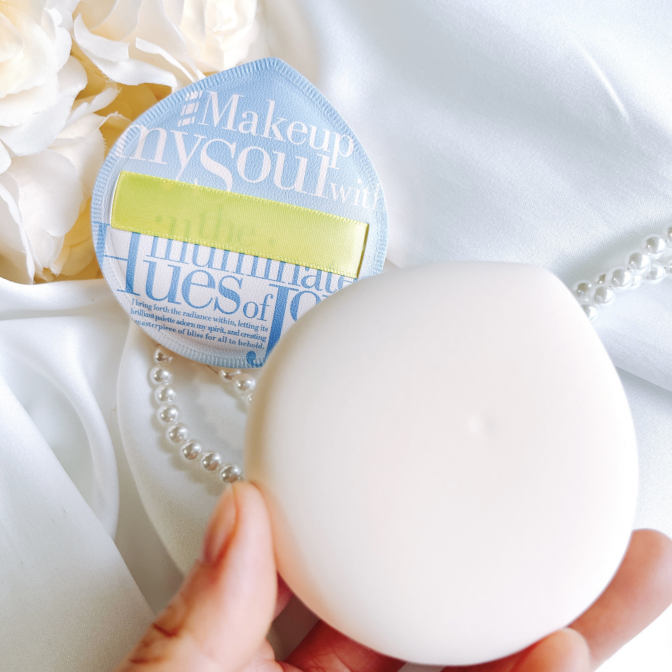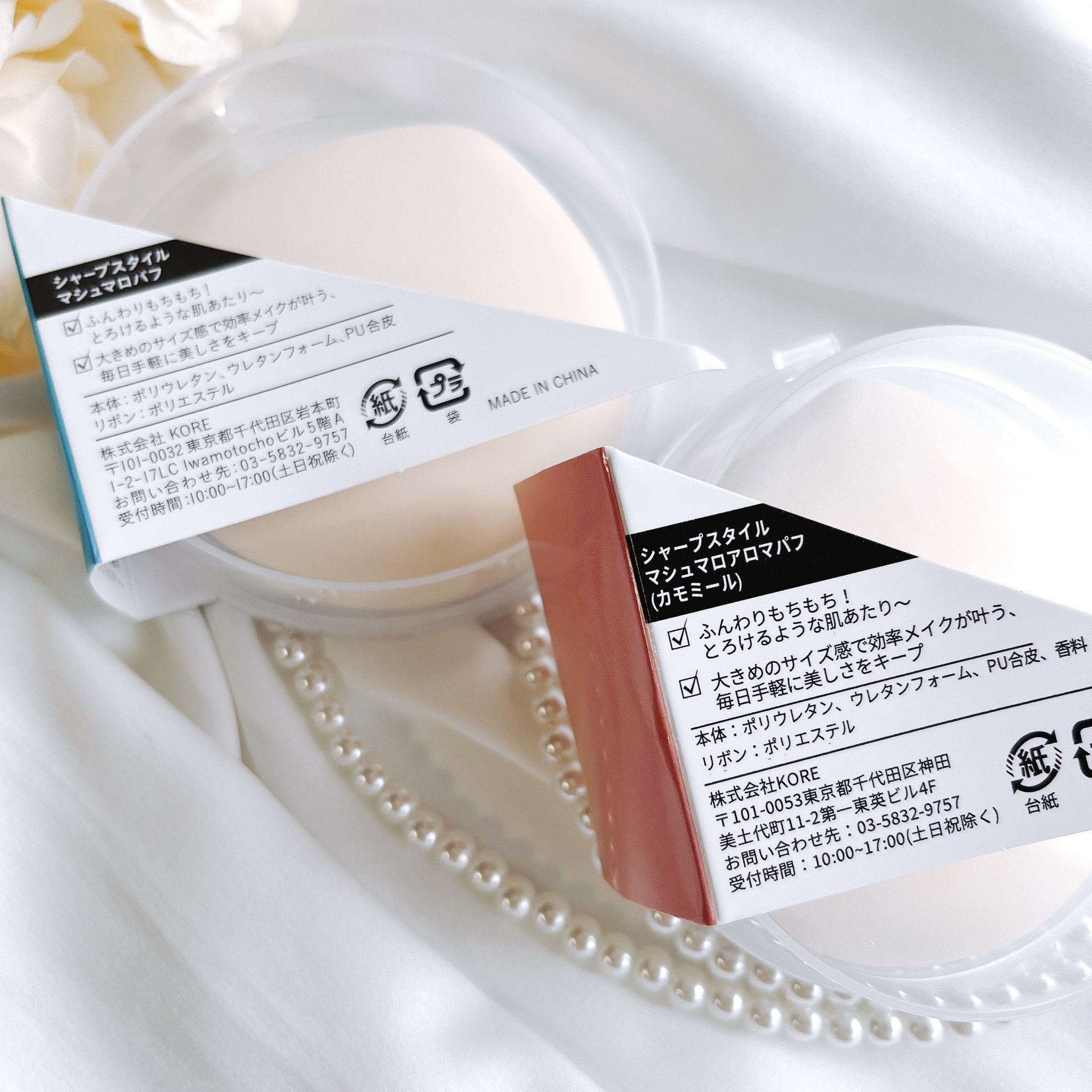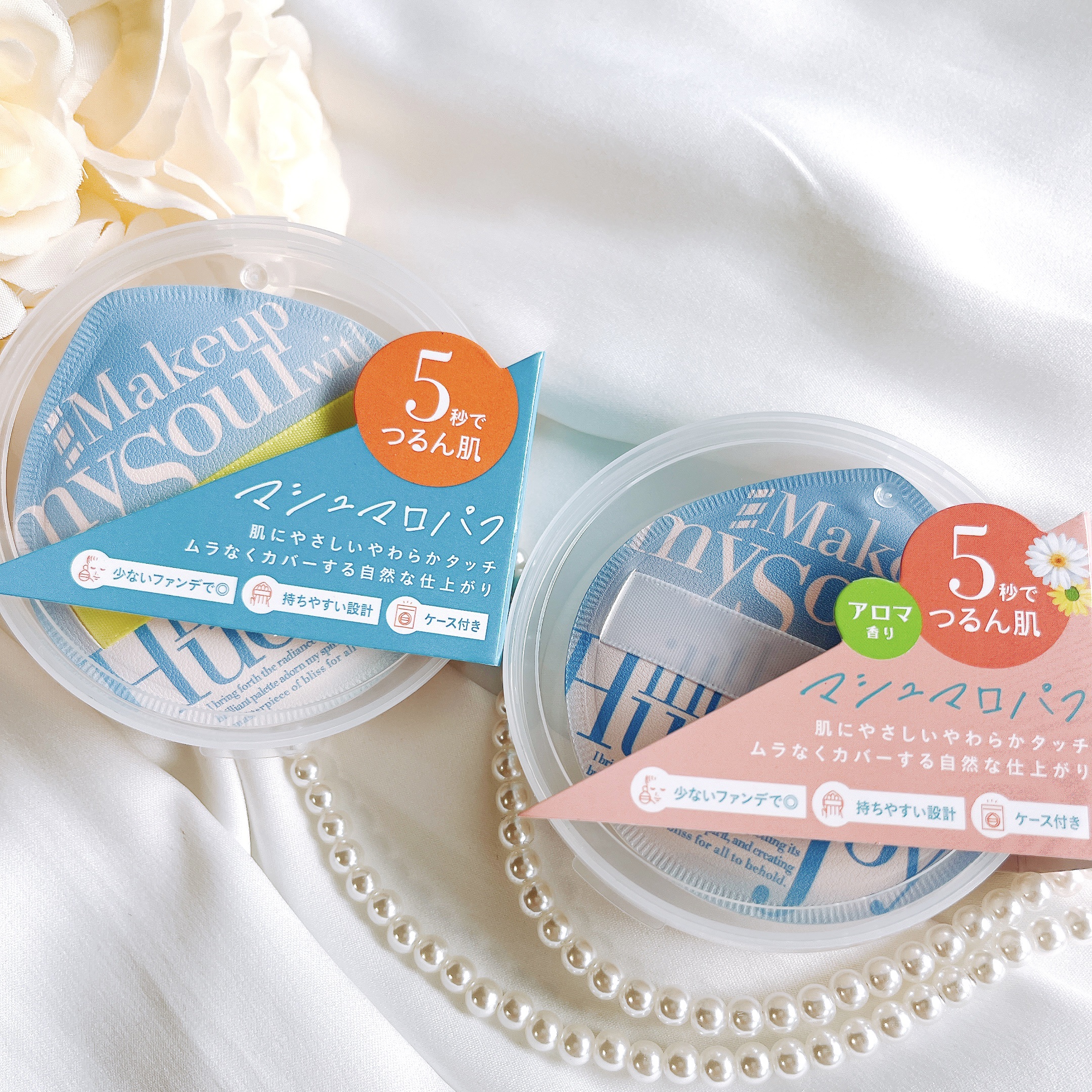 ふんわりもちもち極厚マシュマロパフで5秒でつるん肌に 厚みが1cm以上あるふんわりもちもちのパフは柔らかくて優しい肌あたり 香り付きのパフはほんのりカモミールアロマの香りがして心地いい
