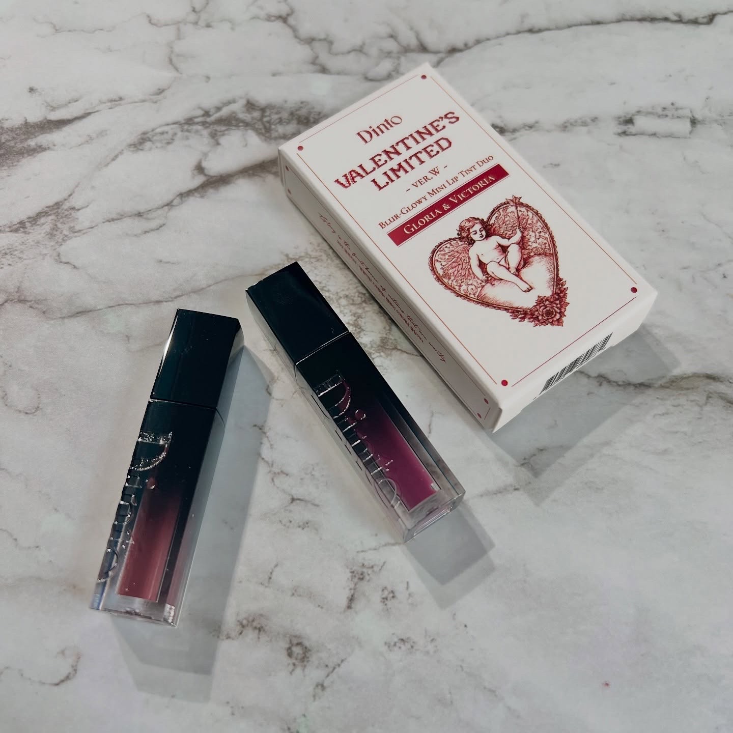 パッケージかわいい&みんな大好きミニサイズ「VALENTINE'S LIMITED Blur-Glowy Mini Lip Tint Duo」です✨ クランベリー果汁が染み込んだ チェリーブルーネット ミルクチョコレートカラー。 ジューシーな付け心地が、Dintoだなあって思いました♥️ しっかり色づいて、でも見た目にはわからないプルっと感が良きなんです。