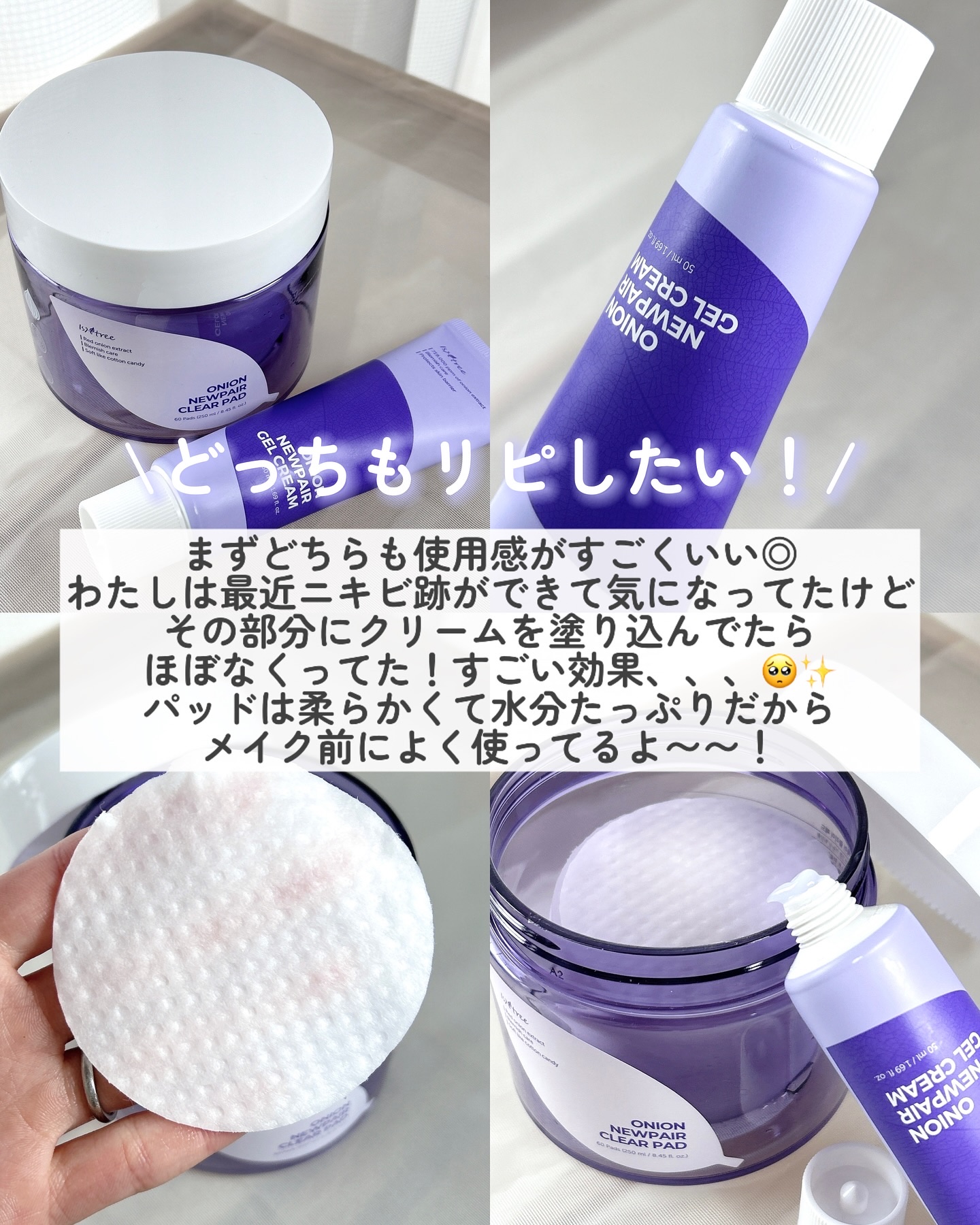 毛穴や、くすみ、黒ずみなどあらゆる跡の悩みにピッタリなオニオンニューペアライン。 このクリアパッドは、拭き取り、パックと色々使えてとっても良い👌 優しい肌あたりで拭き取ることができる✨ 半分にして、パックにしても👌