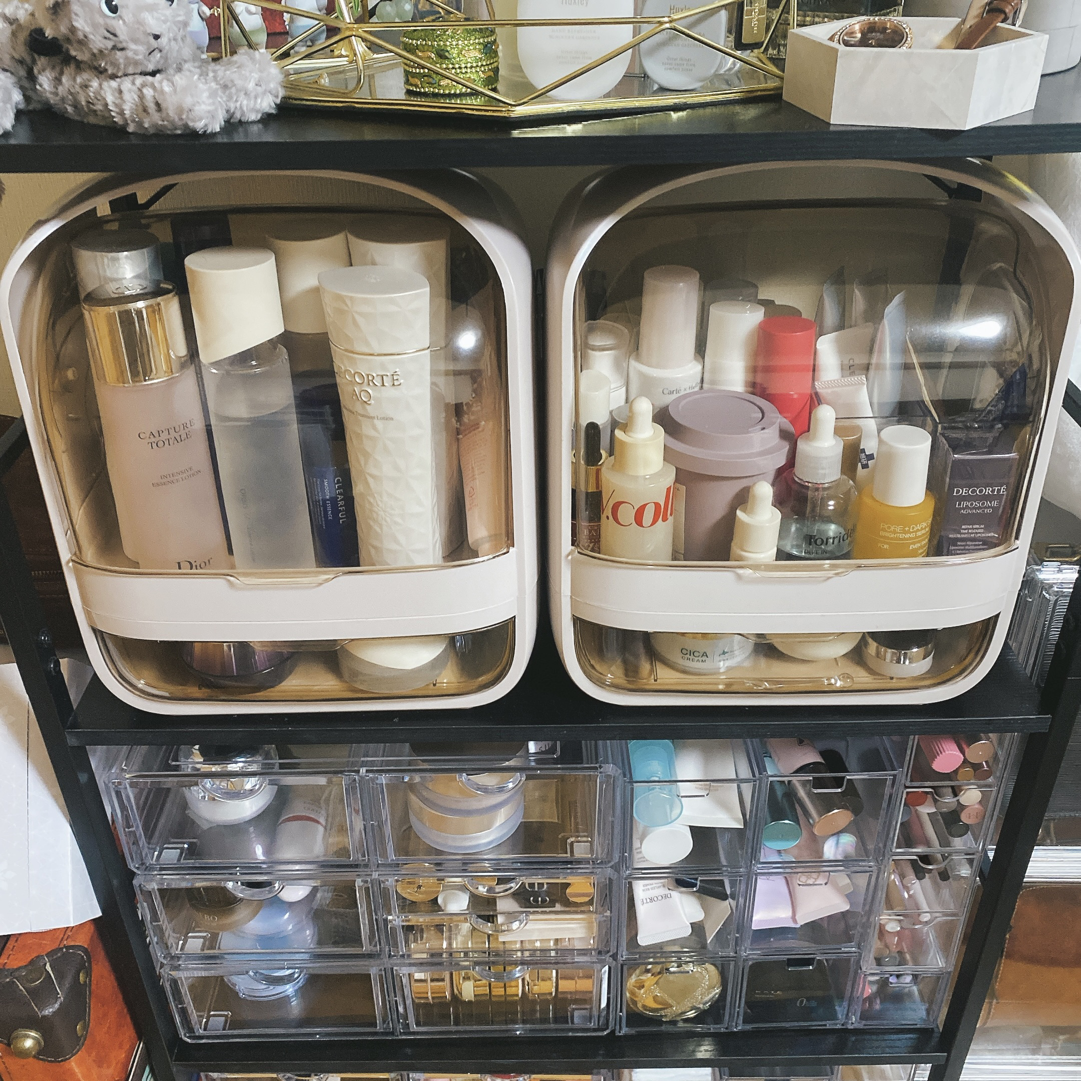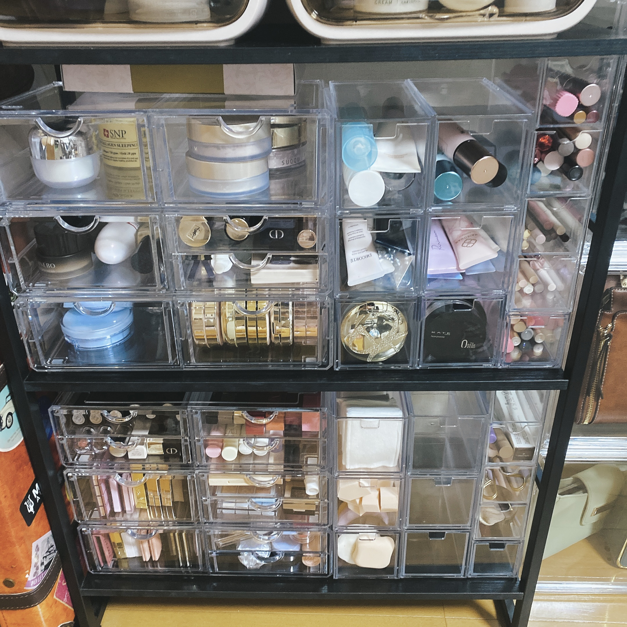 眺めて楽しめるコスメ収納にしています。部屋が狭いので、ドレッサーは置かず、鏡つき本棚を使っています。 アクリルで丈夫なので、かなりの重さを入れても壊れません。高さが丁度よく奥行きがあるので収納力抜群です。 回転するコスメタワーです。プラスチックで、5年くらい使っていて、傷は付きますが壊れず丈夫です。