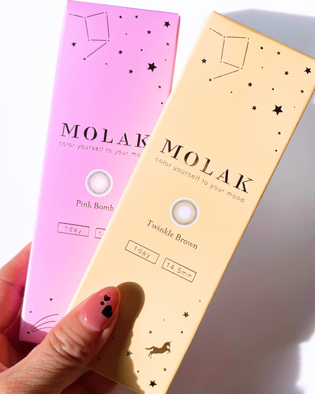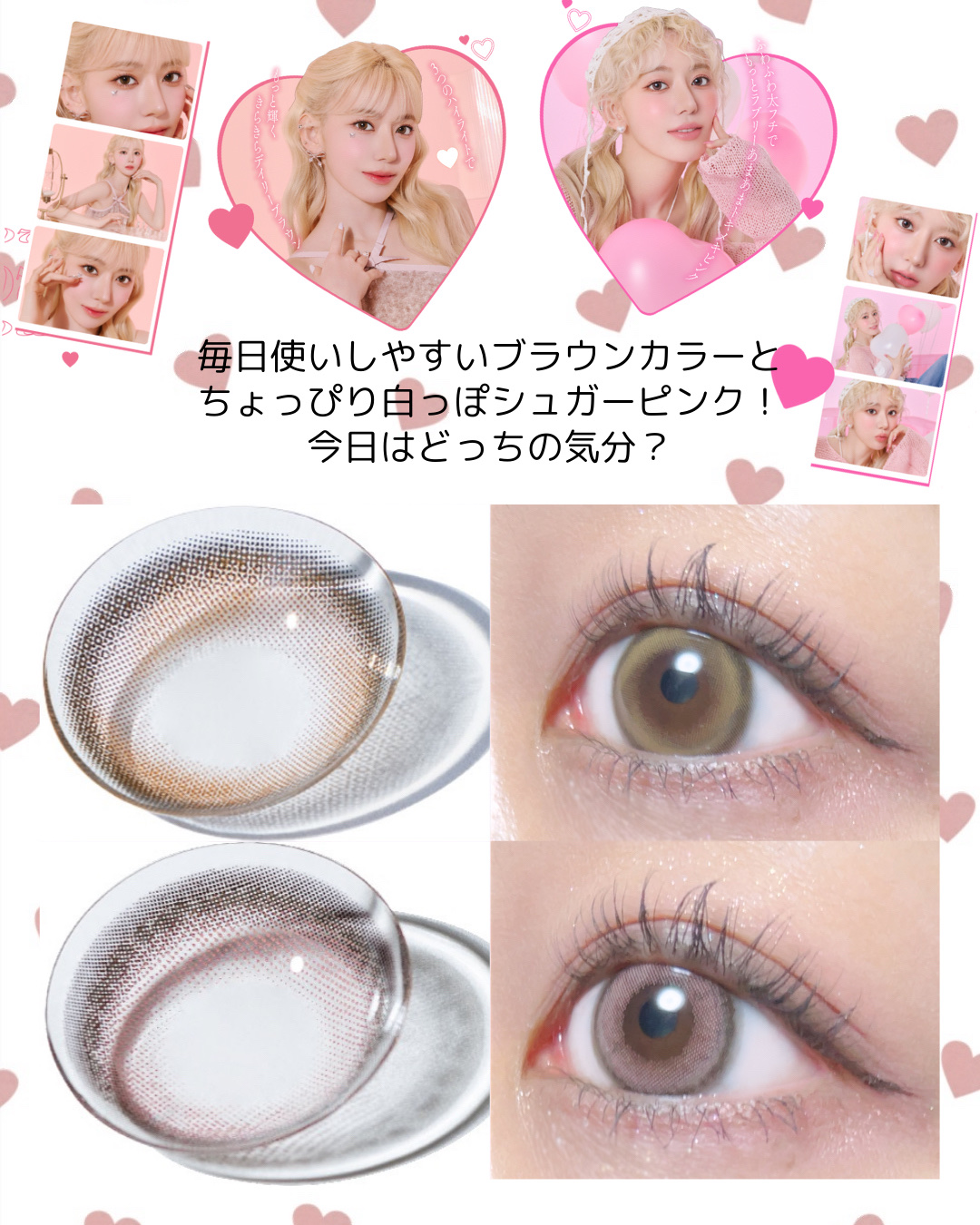 MOLAK 1day 宮脇咲良プロデュース 2/10発売の新色カラコン🌸 トゥインクルブラウン 水光ブラウン×細フチで色素薄い感じの瞳に。 ピンクボム あまあまピンク×太フチで儚げな瞳に。