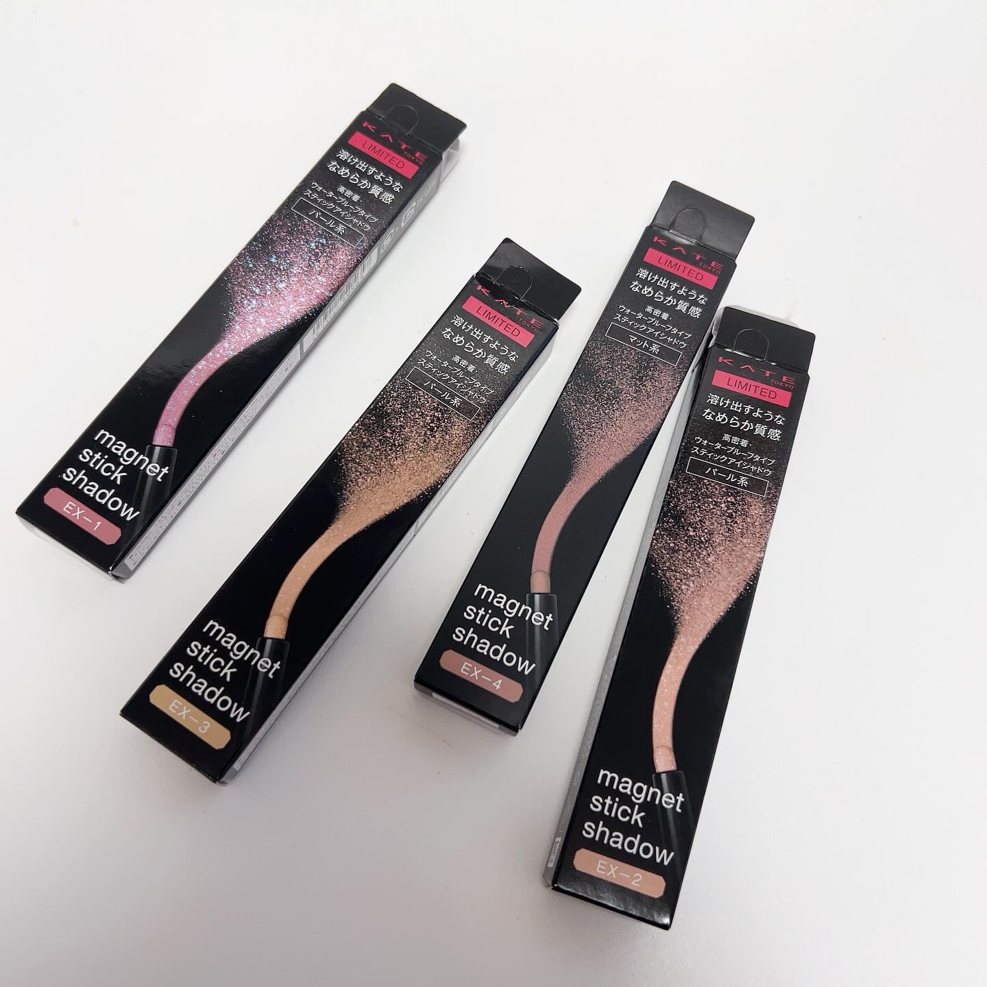 まるで磁石みたいにピタッと密着するアイシャドウ😌KATEの新作 マグネットスティックシャドウ4色をスウォッチ🌸✨ するする描けて、瞼のくぼみにもアイシャドウがたまりにくいよ✨️🥹 他のアイシャドウを使わなくても、1色で簡単にアイメイクが完成しちゃって便利👏 EXー1が偏光の青ラメ入りでお気に入りカラー😍可愛い♡ EXー2と3は繊細パール入りで涙袋にもぴったりなアイシャドウだよ🫶