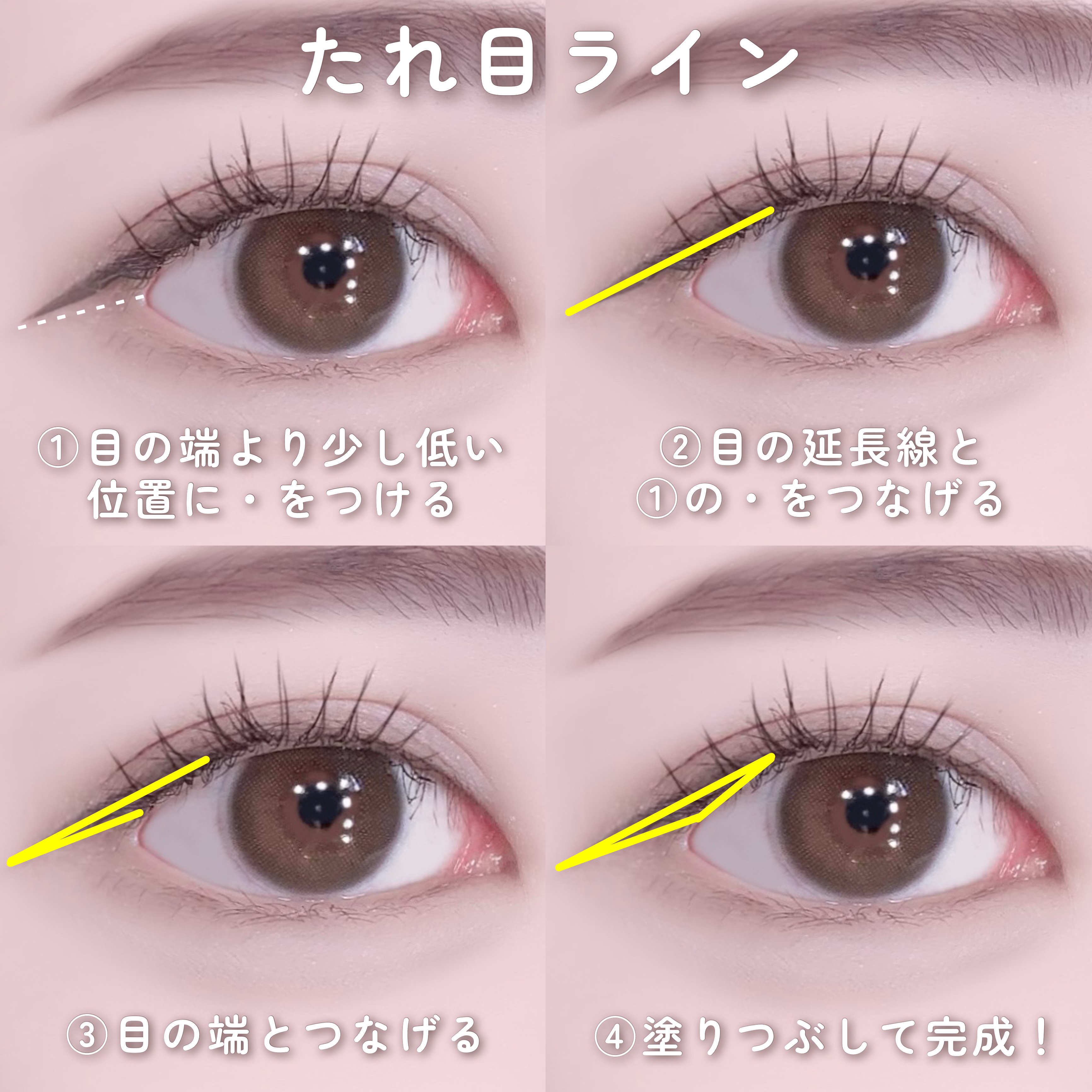 なりたい印象によって変えられる 子鹿アイライン ・ 横に太く短く引いたライン 韓国風アイライン ・ 横に細く長く引いたライン ナチュラルライン ・ 目の形に沿って延長したライン 子猫アイライン ・ 太めで短いはね上げライン きつねライン ・ 自然にはね上げたライン たれ目ライン ・ ぐっと目尻を下げたライン