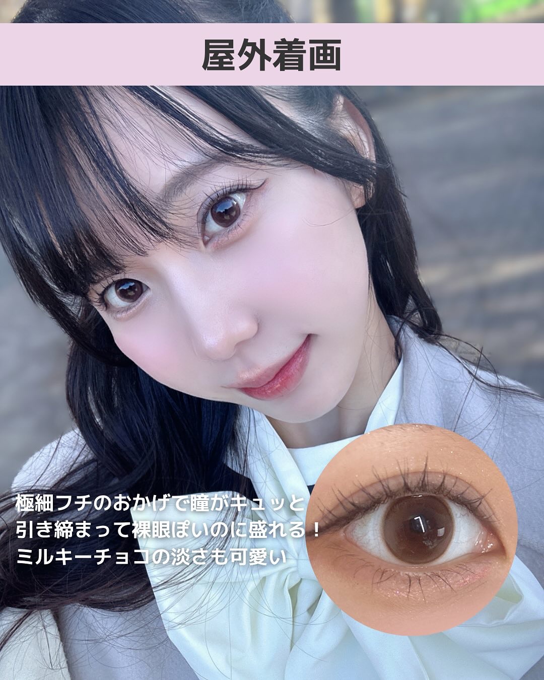 ナチュラルに馴染むのにさりげなく盛れる裸眼アプデカラコン👀! 今回はオススメなチョコレートカラー2タイプをレポ📢 ミルクを混ぜたようなチョコレートカラーがゆるっと儚い瞳を演出してくれる🥺 瞳に馴染みやすい色味でナチュラルに使いやすいしさりげない極細フチが裸眼をアップデートしてくれるよ✨ どちらもかなりナチュラル🥺🤎 カラコン初心者さんや、カラコン卒業したいけどいきなりは無理!って人にもオススメしたい🥰🤎