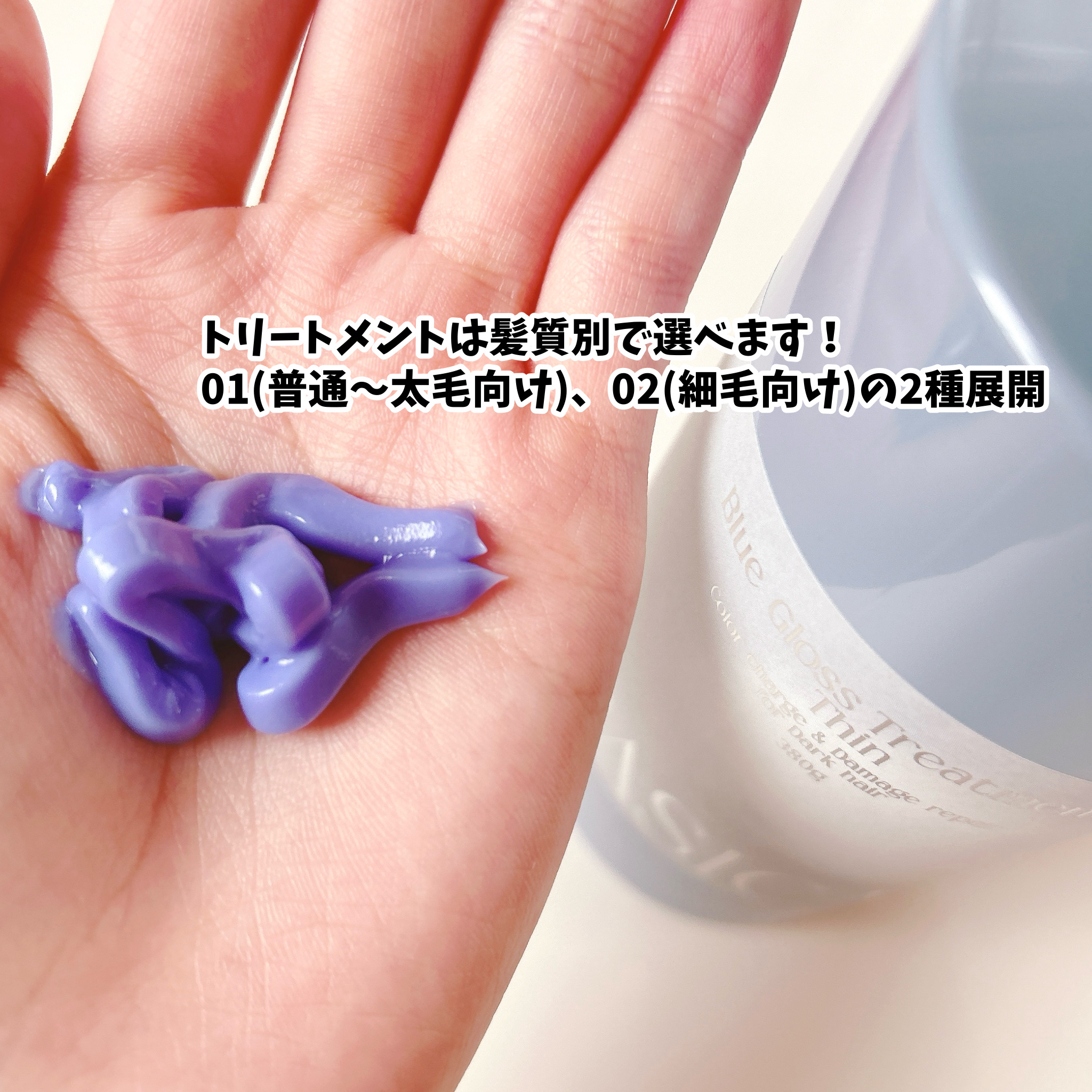 - <シャンプー380ml> 水、コカミドプロピルベタイン、ラウロイルメチルアラニンNa、ココイルメチルタウリンNa、塩化Na、DPG、加水分解コンキオリンタンパク、加水分解ヒアルロン酸、ケラチン(羊毛)、加水分解ケラチン(羊毛)、加水分解水添デンプン、加水分解コラーゲン、水添レシチン、グリコシルトレハロース、ユズ果実エキス、アルギン酸Na、フィトステロールズ、γ-ドコサラクトン、クオタニウム-33、セラミドNG、セラミドAG、セラミドNP、セラミドAP、セラミドEOP、ソルビトール、ラウロイル加水分解シルクNa、グリチルリチン酸2K、デシルグルコシド、ベタイン、ポリクオタニウム-10、コカミドMEA、コカミドDEA、ジステアリン酸PEG-150、PCAイソステアリン酸PEG-40水添ヒマシ油、ジステアリルジモニウムクロリド、ベヘントリモニウムクロリド、BG、PG、プロパンジオール、コレステロール、リンゴ酸、メントール、エタノール、EDTA-2Na、安息香酸Na、サリチル酸、香料、塩基性青99、塩基性紫2 <トリートメント 01 380g> 水、DPG、セテアリルアルコール、オリーブ果実油、ジメチコン、ベヘントリモニウムクロリド、加水分解コンキオリンタンパク、加水分解ヒアルロン酸、ケラチン(羊毛)、加水分解ケラチン(羊毛)、加水分解水添デンプン、加水分解コラーゲン、加水分解シルク、水添レシチン、グリコシルトレハロース、ユズ果実エキス、アルギン酸Na、γ-ドコサラクトン、セラミドNG、セラミドAG、セラミドNP、セラミドAP、セラミドEOP、フィトステロールズ、スクレロカリアビレア種子油、アーモンド油、ポリクオタニウム-92、クオタニウム-33、カエサルピニアスピノサヒドロキシプロピルトリモニウムクロリド、ソルビトール、ヒアルロン酸Na、ベタイン、ビスジグリセリルポリアシルアジペート-2、セタノール、ステアリルアルコール、ベヘニルアルコール、コレステロール、ステアロキシプロピルトリモニウムクロリド、ジステアリルジモニウムクロリド、乳酸、クエン酸、ジグリセリン、BG、PG、プロパンジオール、イソプロパノール、アモジメチコン、アミノプロピルジメチコン、EDTA-2Na、安息香酸Na、香料、HC青15、塩基性青99、塩基性紫2 <トリートメント 02 380g> 水 、DPG 、セテアリルアルコール 、オリーブ果実油 、ジメチコン 、ベヘントリモニウムクロリド 、加水分解コンキオリンタンパク 、加水分解ヒアルロン酸 、ケラチン(羊毛) 、加水分解ケラチン(羊毛) 、加水分解水添デンプン 、加水分解コラーゲン 、加水分解シルク 、水添レシチン 、グリコシルトレハロース 、ユズ果実エキス 、アルギン酸Na 、γ-ドコサラクトン 、セラミドNG 、セラミドAG 、セラミドNP 、セラミドAP 、セラミドEOP 、フィトステロールズ 、スクレロカリアビレア種子油 、アーモンド油 、ポリクオタニウム-92 、クオタニウム-33 、カエサルピニアスピノサヒドロキシプロピルトリモニウムクロリド 、ソルビトール 、ヒアルロン酸Na 、ベタイン 、ビスジグリセリルポリアシルアジペート-2 、セタノール 、ステアリルアルコール 、ベヘニルアルコール 、コレステロール 、ステアロキシプロピルトリモニウムクロリド 、ジステアリルジモニウムクロリド 、乳酸 、クエン酸 、ジグリセリン 、BG 、PG 、プロパンジオール 、イソプロパノール 、アモジメチコン 、アミノプロピルジメチコン 、EDTA-2Na 、安息香酸Na 、香料 、HC青15 、塩基性青99 、塩基性紫2