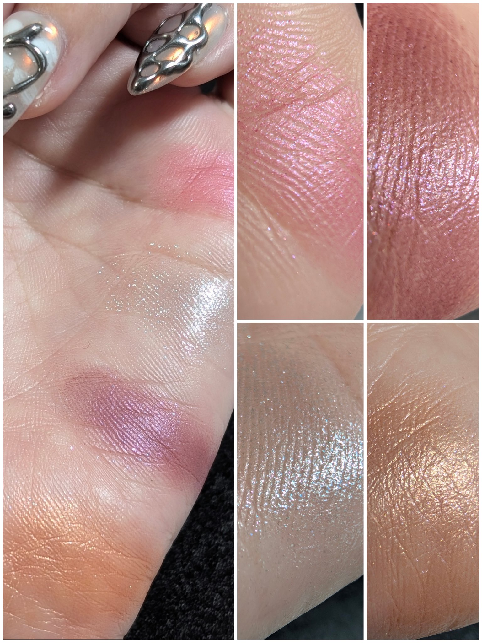 ブルームクチュールアイズは宝石のような輝きで仕上げきらめき華やぐ満開ジュエルブーケアイズ ラメもジル史上最大の大きさのものを使用 縦割りだとピンク味が主張して横割りだと赤みピンクが主張する ジュエルドブーケは全体的にピンク味が主体でラメも青みピンクがどのパレットにも大小はあるけれど、推してる気がしました!! ひと味違ったジルの今回のアイパレットも既存のバレットも大好きです🥰🥰