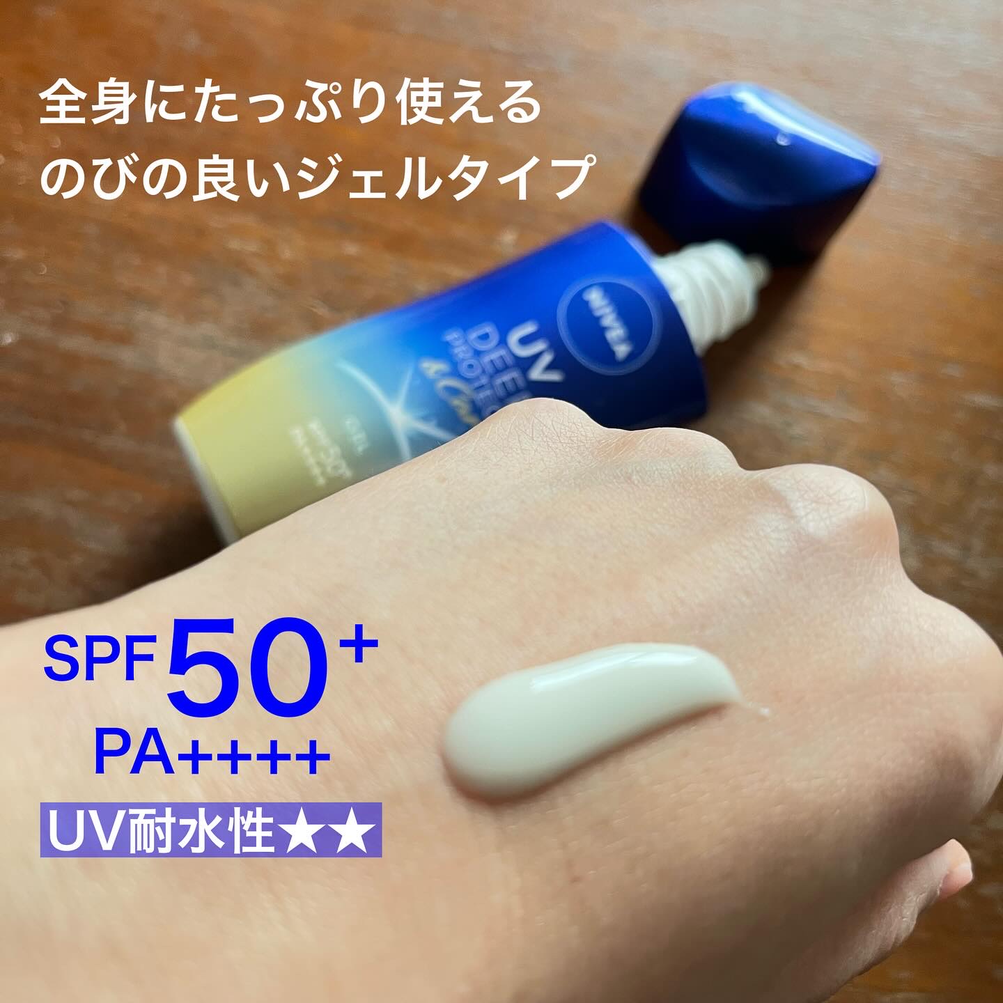 ニベア最強*1 のUVカット効果(SPF50+/PA++++) と撥水効果 日やけによるシミ・そばかすを防ぎながら、肌にうるおいを与えます。 のびの良いジェルタイプで本当に使いやすい◎ 化粧下地としても使えるところも好き❤️