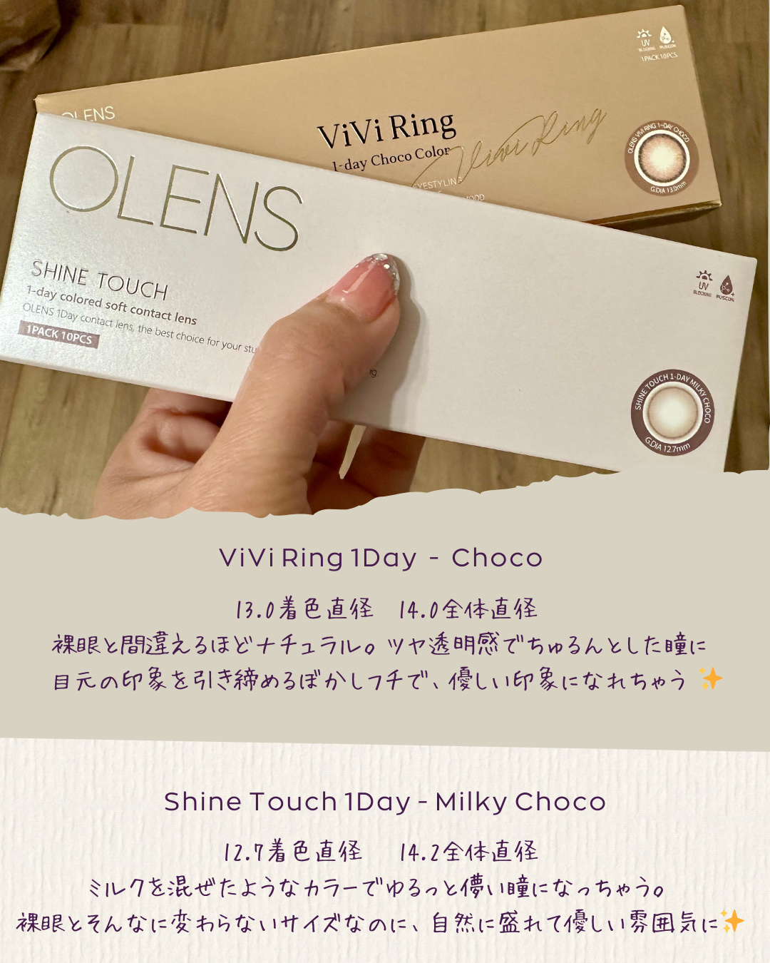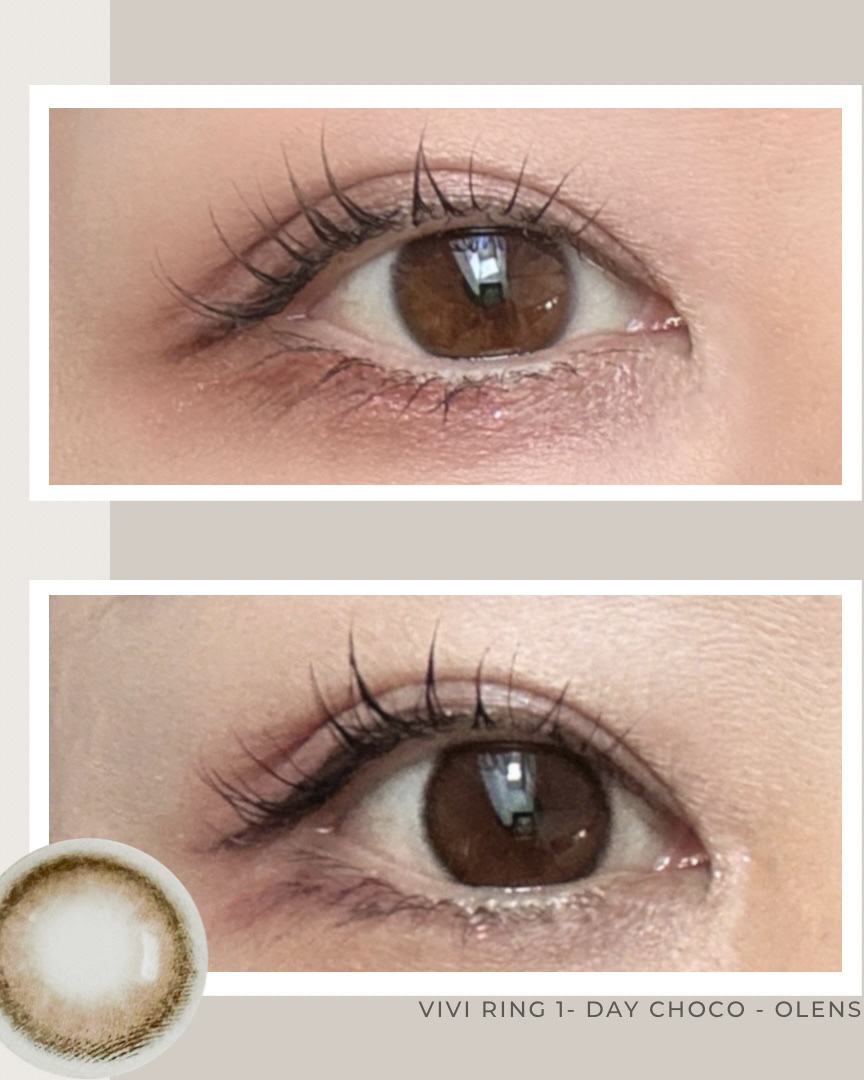 ミルクを混ぜたような淡いチョコレートカラコン🍫 ふんわり細フチで瞳を強調しながらも着色直径はあまり大きくないから裸眼風な瞳を演出できる!! 瞳に馴染む裸眼風なデザイン。 ふわっとボケて可愛い瞳に! どっちもナチュラルで使いやすい💓