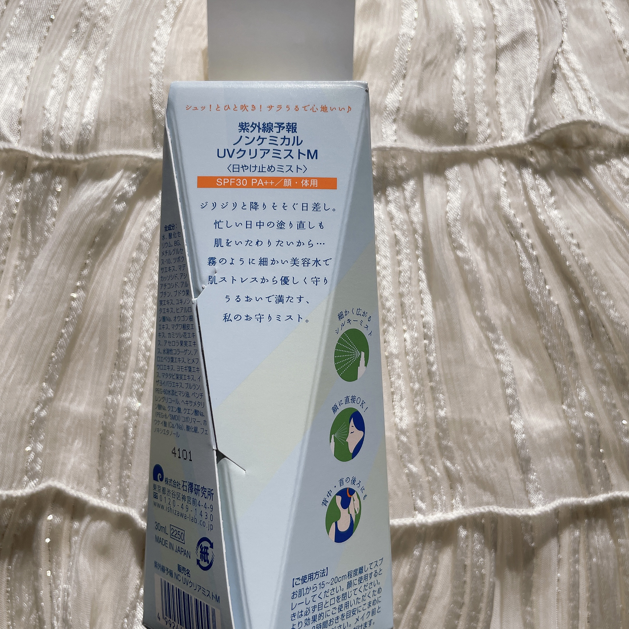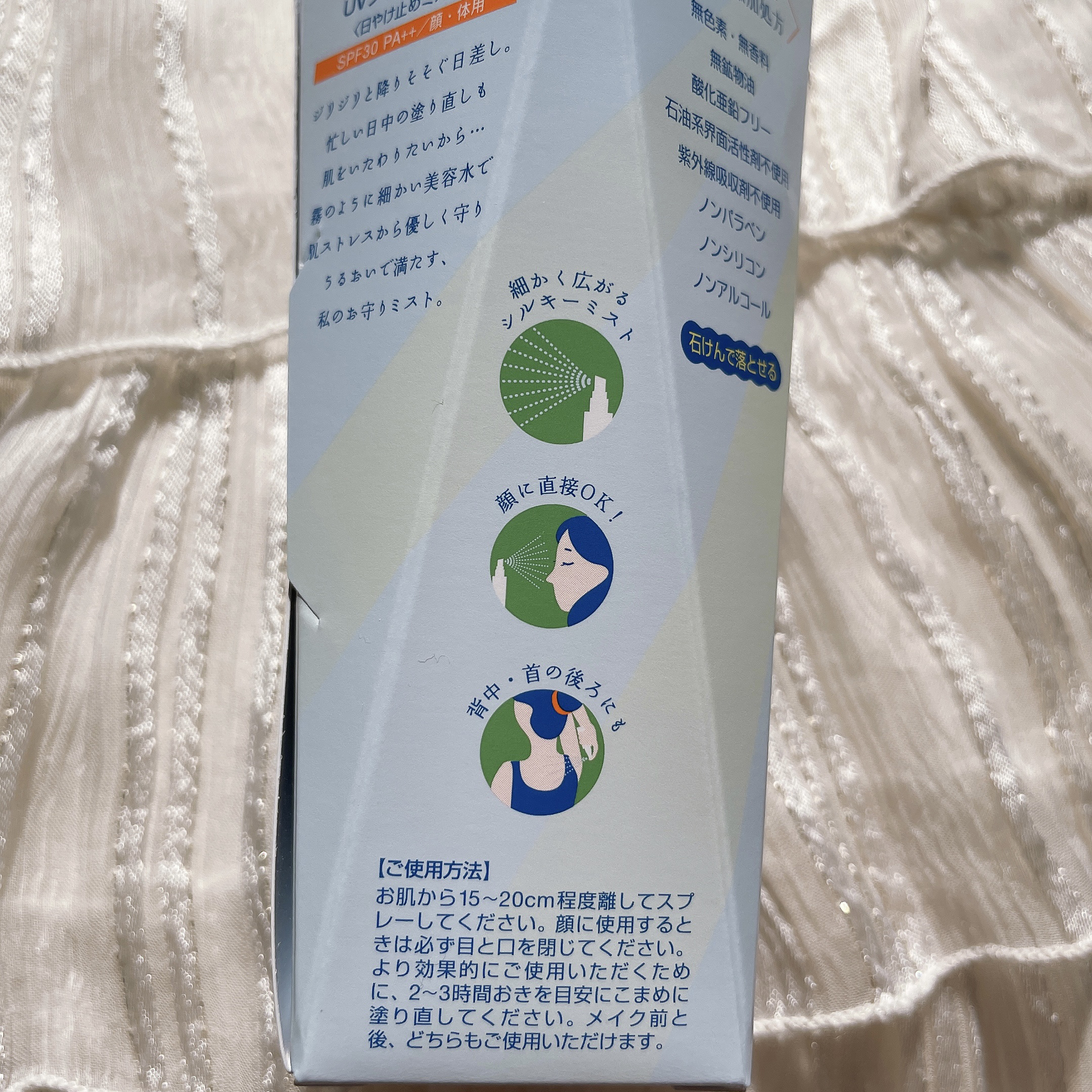 - 霧のように細かい美容水で乾燥による外的刺激から優しい使い心地で守り、うるおいで満たすお守りUVミスト。 美容の大敵になるUV、ブルーライト*1、花粉・PM2.5*2をマルチカット! 白浮きしないのに紫外線吸収剤不使用で、敏感肌にも使えます。 メイクの上からでもOK、逆さでも使えるから日中の塗り直しにもピッタリ♪ ・SPF30 PA++ ・顔、体用 ・石けんで落とせる ・無色素、無香料、無鉱物油、酸化亜鉛フリー、石油系界面活性剤不使用、紫外線吸収剤不使用(ノンケミカル)、ノンパラベン、ノンシリコン、ノンアルコール *1 カット率93.3% *2 肌への付着を防ぎます。すべての微粒子汚れの付着を防ぐわけではありません。