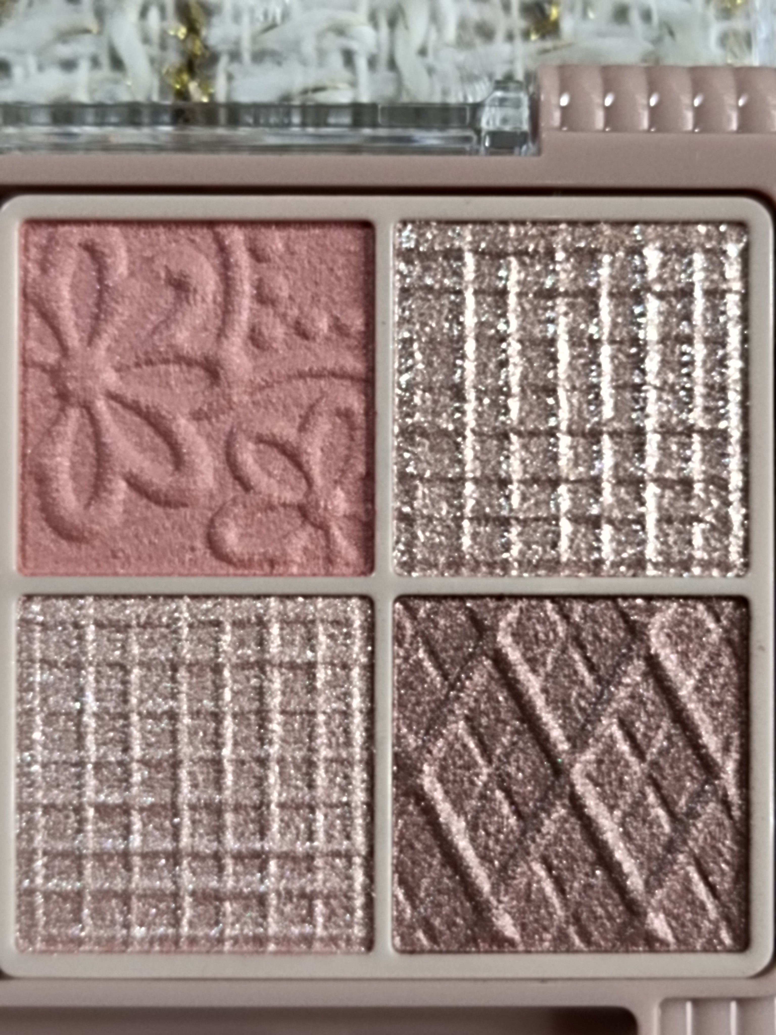 可愛すぎてやばいです。 思ったよりコンパクトで持ち運びもしやすいしこのパケ!!!!!可愛すぎるやろ!乙女心くすぐるお姫様パケで昇天しました。 爆モテしそうな大優勝カラー!! YouTuberさんが仰っていたように色味だけではなくてこのツイード柄になっている部分の色のツヤ感とラメ感がやばいんです(;_;)濡れたようなツヤ感がたまらなく綺麗すぎて🥹🥹🥹 このパレットは色味もラメ感もパケも全人間が大優勝できるので本当におすすめします!!!!!!!