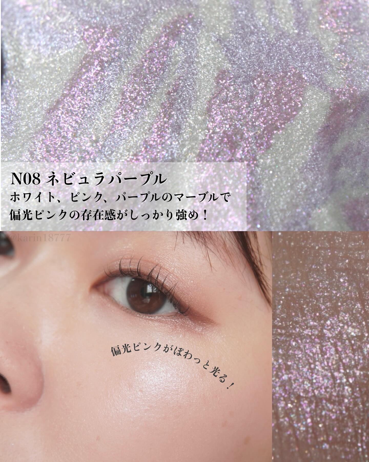 - <N01 シルバーホワイト> マイカ、酸化チタン、ペンチレングリコール、ジメチコン、ポリメチルシルセスキオキサン、酸化スズ、トリエトキシカプリリルシラン、リンゴ酸ジイソステアリル、ラウロイルリシン、フェニルトリメチコン、(ジメチコン/ビニルジメチコン)クロスポリマー、ホウケイ酸(Ca/Na) <N02 ライトシャンパン> マイカ、酸化チタン、ペンチレングリコール、ジメチコン、ポリメチルシルセスキオキサン、酸化スズ、トリエトキシカプリリルシラン、リンゴ酸ジイソステアリル、ラウロイルリシン、フェニルトリメチコン、(ジメチコン/ビニルジメチコン)クロスポリマー、ホウケイ酸(Ca/Na) <N07 ネビュラブルー(日本限定色)> マイカ、酸化チタン、ペンチレングリコール、ジメチコン、ポリメチルシルセスキオキサン、酸化スズ、トリエトキシカプリリルシラン、リンゴ酸ジイソステアリル、ラウロイルリシン、フェニルトリメチコン、(ジメチコン/ビニルジメチコン)クロスポリマー、ホウケイ酸(Ca/Na) <N08 ネビュラパープル(日本限定色)> マイカ、酸化チタン、ペンチレングリコール、ジメチコン、ポリメチルシルセスキオキサン、酸化スズ、トリエトキシカプリリルシラン、リンゴ酸ジイソステアリル、ラウロイルリシン、フェニルトリメチコン、(ジメチコン/ビニルジメチコン)クロスポリマー、ホウケイ酸(Ca/Na) <01 シルバーホワイト> ポリメチルシルセスキオキサン、ホウケイ酸(Ca/Na)、フェニルトリメチコン、リンゴ酸ジイソステアリル、ジメチコン、酸化チタン、(ジメチコン/ビニルジメチコン)クロスポリマー、ペンチレングリコール、マイカ、酸化スズ、ラウロイルリシン、トリエトキシカプリリルシラン <02 ライトシャンパン> ポリメチルシルセスキオキサン、フェニルトリメチコン、ホウケイ酸(Ca/Al)、リンゴ酸ジイソステアリル、マイカ、ジメチコン、酸化チタン、(ジメチコン/ビニルジメチコン)クロスポリマー、ペンチレングリコール、酸化鉄、トリエトキシカプリリルシラン、酸化スズ、ラウロイルリシン <03 シャンパンゴールド> ポリメチルシルセスキオキサン、フェニルトリメチコン、ホウケイ酸(Ca/Al)、リンゴ酸ジイソステアリル、マイカ、ジメチコン、酸化チタン、(ジメチコン/ビニルジメチコン)クロスポリマー、ペンチレングリコール、酸化鉄、ラウロイルリシン、酸化スズ、トリエトキシカプリリルシラン、カルミン <05 シャンパンピンク> ポリメチルシルセスキオキサン、フェニルトリメチコン、ホウケイ酸(Ca/Al)、リンゴ酸ジイソステアリル、マイカ、酸化チタン、ジメチコン、(ジメチコン/ビニルジメチコン)クロスポリマー、ペンチレングリコール、酸化鉄、酸化スズ、カルミン、ラウロイルリシン、トリエトキシカプリリルシラン