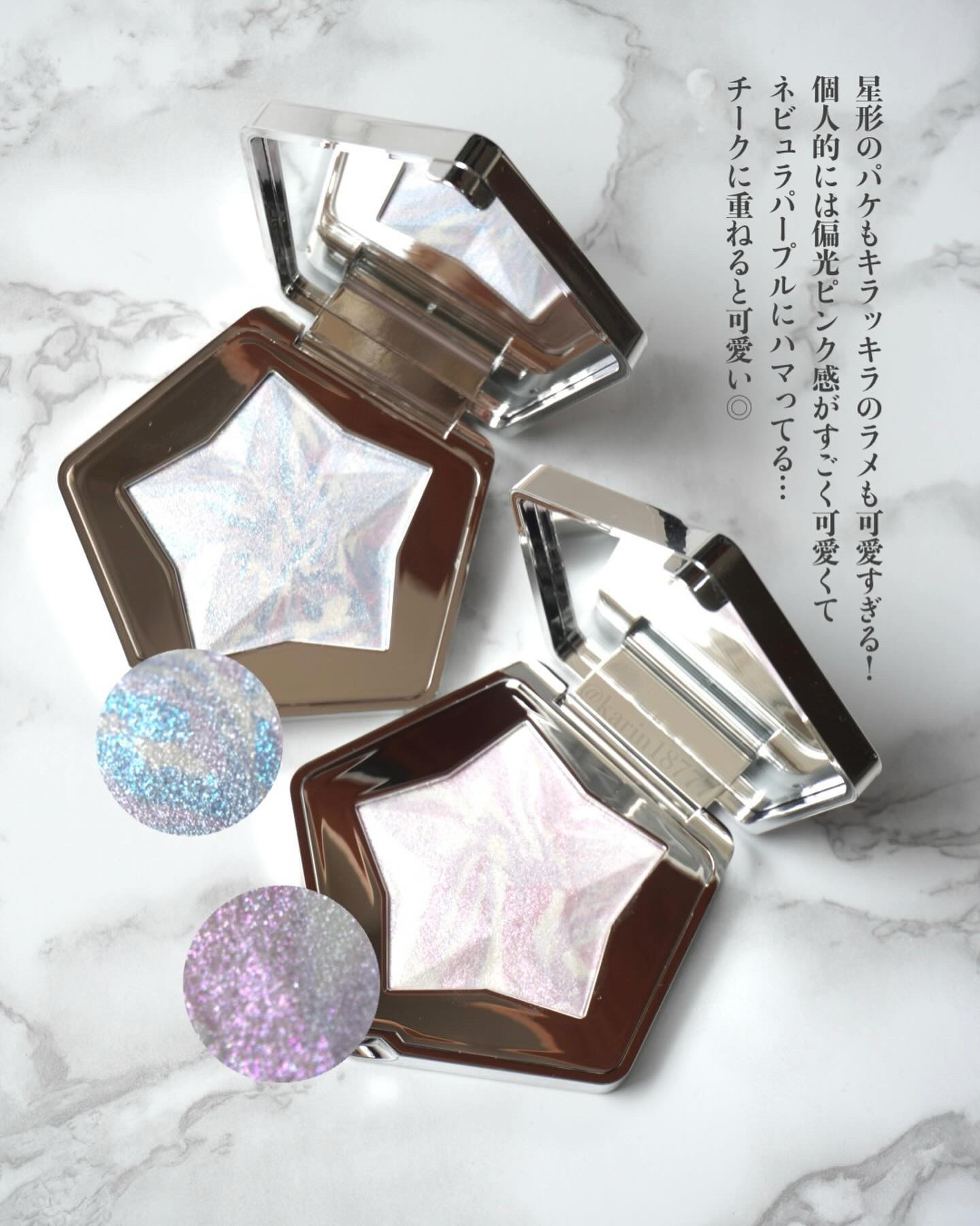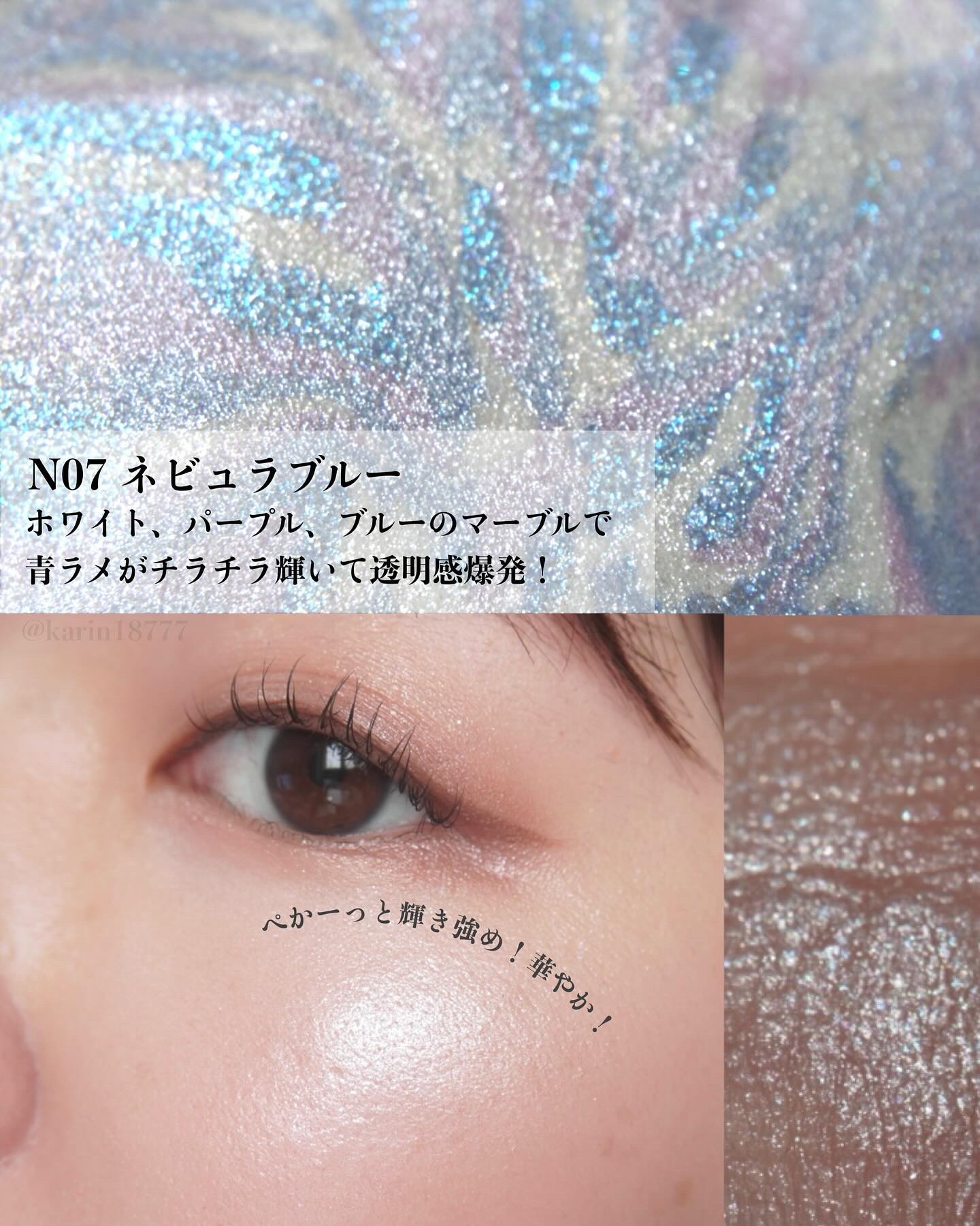 - 「ダイヤモンドのような輝き」天の川のように輝く、透明感と輝きに優れた真珠のような光沢。 複数のファインダイヤモンドの輝きを再現 <01 シルバーホワイト> シルバーホワイトのカラーが美しく輝いてツヤと透明感をプラス。なめらかでモチっとしたテクスチャーと小粒のラメが美しいツヤ肌を演出。Tゾーンや頬骨、デコルテなど光を与えたい部分に塗ればダイアモンドのように輝く。 <02 ライトシャンパン> ライトシャンパンのカラーが血色感と自然な光沢感をプラス。なめらかでモチっとしたテクスチャーと小粒のラメが美しいツヤ肌を演出。Tゾーンや頬骨、デコルテなど光を与えたい部分に塗ればダイアモンドのように輝く。 <03 シャンパンゴールド> シャンパンゴールドのカラーが表情を華やかに引き立てる。なめらかでモチっとしたテクスチャーと小粒のラメが美しいツヤ肌を演出。Tゾーンや頬骨、デコルテなど光を与えたい部分に塗ればダイアモンドのように輝く。 <05 シャンパンピンク> シャンパンピンクのカラーが血色感と透明感を与える。チークに重ねればピンクが引き立つ!なめらかでモチっとしたテクスチャーと小粒のラメが美しいツヤ肌を演出。Tゾーンや頬骨、デコルテなど光を与えたい部分に塗ればダイアモンドのように輝く。 <N01 シルバーホワイト> シルバーカラーのきらめきで、一瞬で透明感ある印象に。 小粒パール+大粒グリッターの組み合わせが、星屑のように繊細かつ大胆に煌めいてワンランク上のメイクに仕上げる。なめらか&モチっとした使用感で肌に高密着。 光を反射させる高屈折オイル配合でどの角度でもツヤ肌を実現。 鼻・頬・目頭・眉下以外にも、肩やデコルテに仕込めばお顔のツヤとリンクして、内から輝くような自然な印象に。 <N02 ライトシャンパン> ライトシャンパンのカラーが肌の色に自然になじみながら、ほどよいツヤと立体感をプラス。 小粒パール+大粒グリッターの組み合わせが、星屑のように繊細かつ大胆に煌めいてワンランク上のメイクに仕上げる。 なめらか&モチっとした使用感で肌に高密着。光を反射させる高屈折オイル配合でどの角度でもツヤ肌を実現。 鼻・頬・目頭・眉下以外にも、肩やデコルテに仕込めばお顔のツヤとリンクして、内から輝くような自然な印象に。 <N07 ネビュラブルー 日本限定色> ブルーとパープルの大粒ラメと、細かいシルバーラメが混ぜ合わさって色白な肌にツヤ感を与えてより明るく見せることができる! <N08 ネビュラパープル 日本限定色> パープルとピンク色の大粒ラメと、細かいシルバーラメが混ぜ合わさって、どのような肌色にもぴったり!かわいらしい雰囲気が作れる。