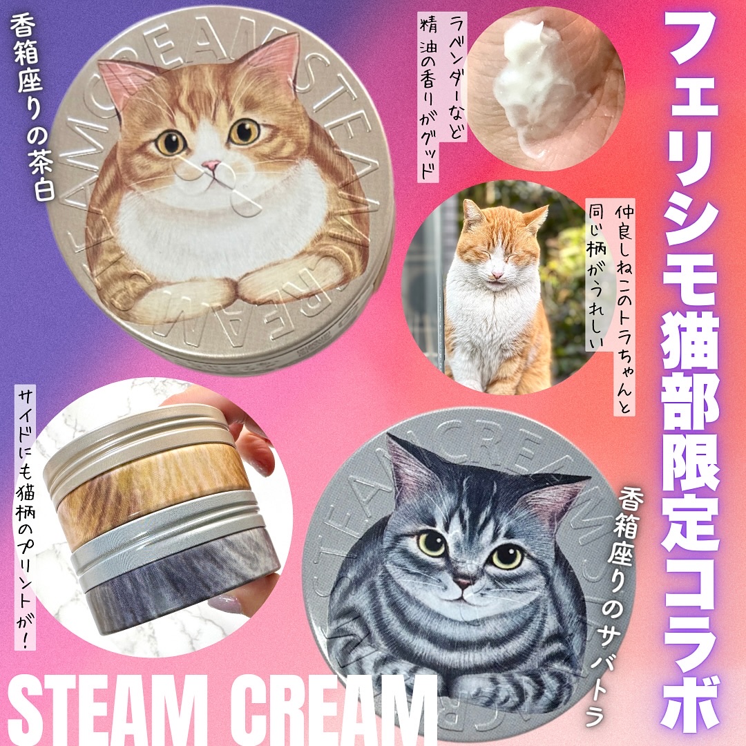 蒸気で手づくりしたこの<スチームクリーム>は、これ一つで様々なケアを叶えてくれる、とても優秀なクリームです✨ クリームにはスーパーフードとしても有名なオートミールが配合されており、さらにヴィーガン・クルエルティフリーも叶えられています。 今回使用させていただいたデザインは猫好きにはたまらない、フェリシモ「猫部」コラボレーションデザイン。