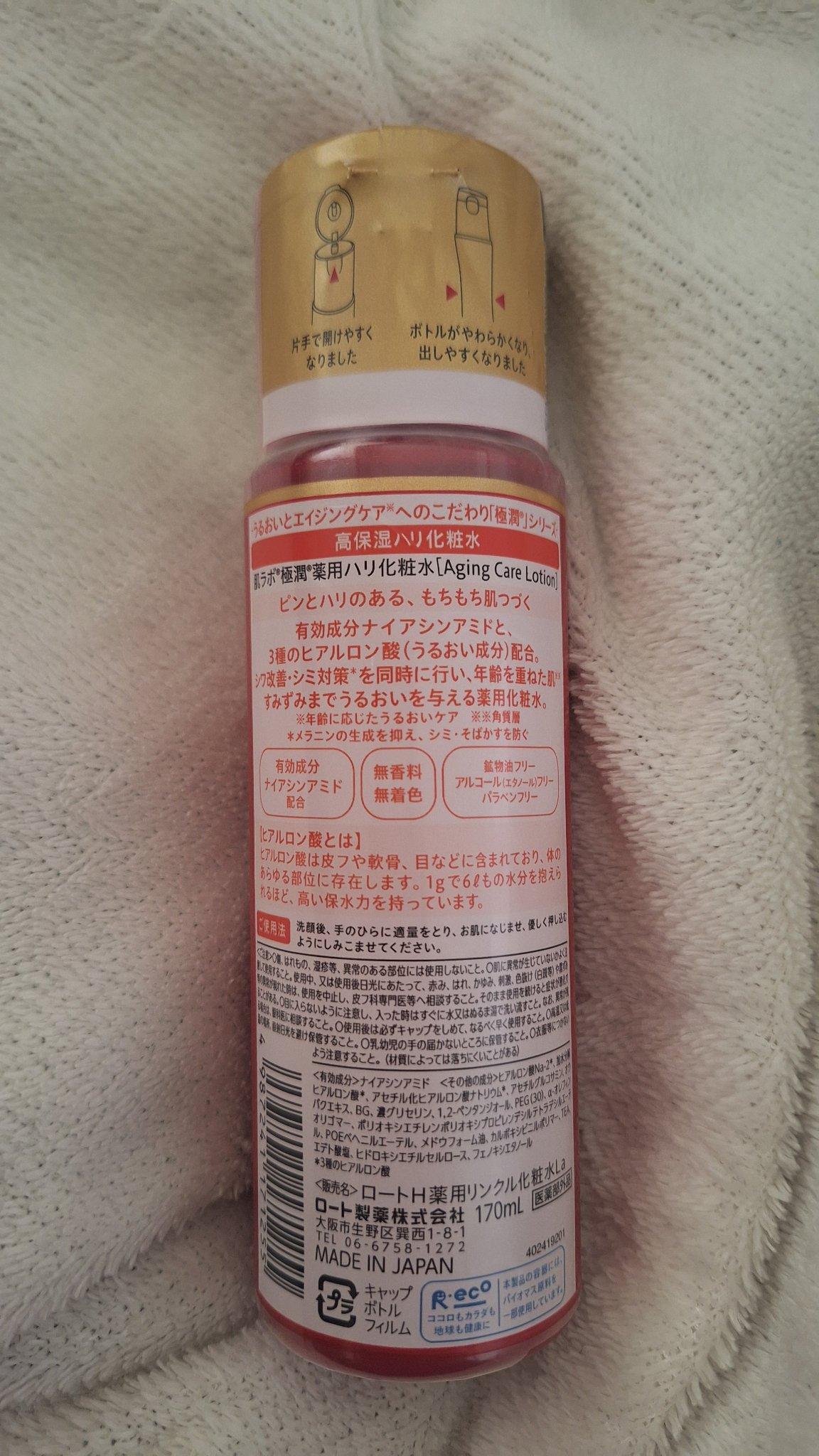- 【医薬部外品】 エイジングケア*1にこだわった極潤シリーズです。有効成分ナイアシンアミドと、3種のヒアルロン酸(うるおい成分)配合。シワ改善・シミ対策*2を同時に行い、年齢を重ねた大人の肌*3に、すみずみまでうるおいを与える薬用化粧水です。無香料・無着色・鉱物油フリー・アルコール(エタノール)フリー・パラベンフリー。*1:年齢に応じたうるおいケア*2:メラニンの生成を抑え、シミ・そばかすを防ぐ*3:角質層