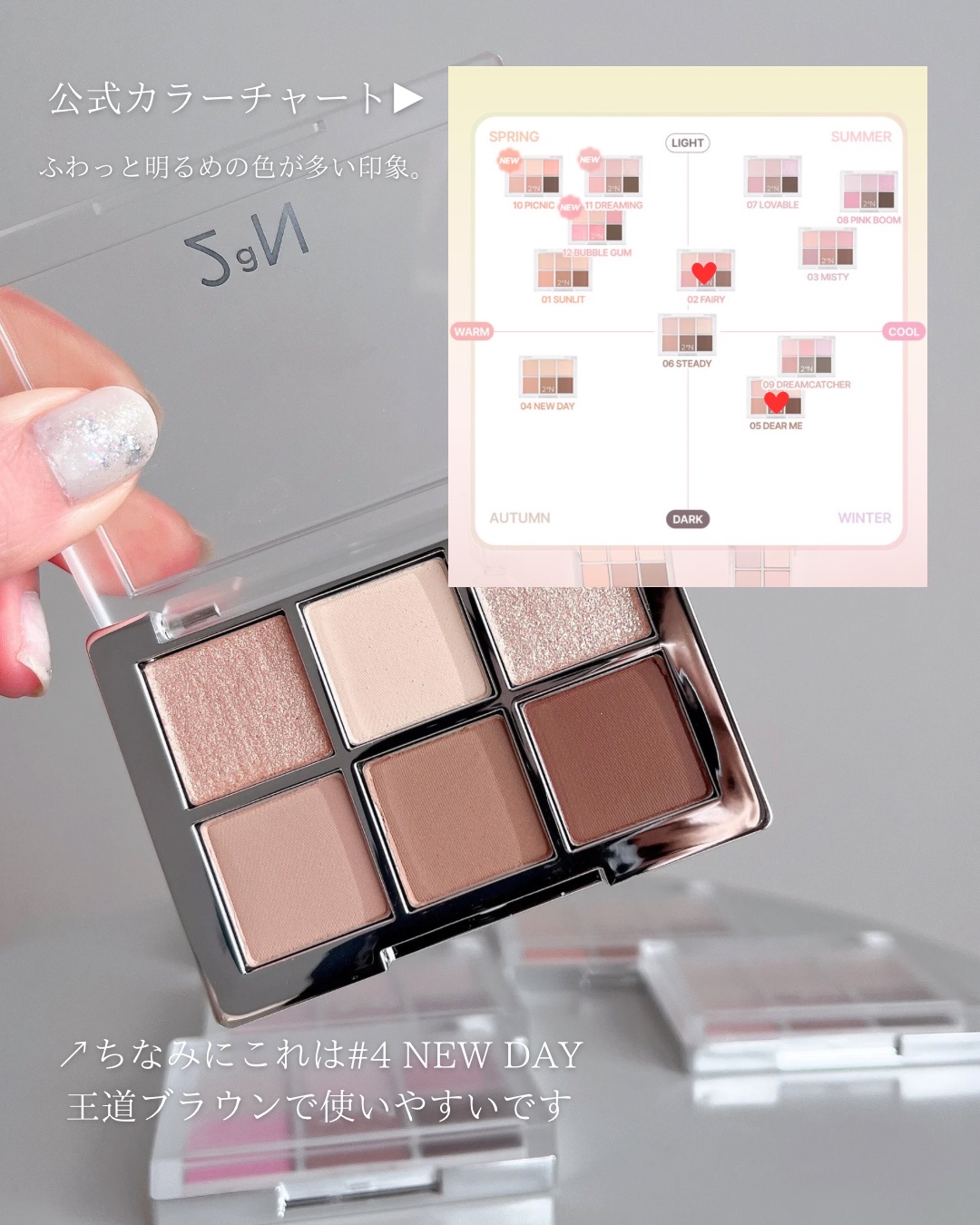 - <04 ニューデイ> タルク、マイカ、ジメチコン、合成フルオロフロゴパイト、酸化鉄、酸化チタン、ホウケイ酸(Ca/チタン)、ナイロン-12、オクテニルコハク酸デンプンAl、シリカ、メタクリル酸メチルクロスポリマー、窒化ホウ素、ステアロイルオキシステアリン酸オクチルドデシル、フェニルトリメチコン、ミリスチン酸Mg、ジエチルヘキサン酸ネオペンチルグリコール、メチルプロパンジオール、ラウリン酸ヘキシル、ヘキサ(ヒドロキシステアリン酸/ステアリン酸/ロジン酸)ジペンタエリスリチル、グンジョウ、(ジメチコン/ビニルジメチコン)クロスポリマー、ホウケイ酸(Ca/Al)、プロパンジオール、ステアリン酸Mg、(セバシン酸/イソパルミチン酸)ジグリセリル、トリエトキシカプリリルシラン、トリ(カプリル酸/カプリン酸)グリセリル、トリエチルヘキサノイン、セスキイソステアリン酸ソルビタン、マカデミア種子油、リンゴ酸ジイソステアリル、マンガンバイオレット、フェノキシエタノール、ステアリン酸ジメチコノール、合成ワックス、ラウロイルリシン、水酸化Al、メチコン、酸化スズ、サラソウジュ種子脂、水添レシチン、カルミン、カオリン、黄4、赤226、マルトデキストリン、トコフェロール <07 ラヴァブル> タルク、ジメチコン、マイカ、合成フルオロフロゴパイト、酸化チタン、シリカ、ホウケイ酸(Ca/チタン)、メタクリル酸メチルクロスポリマー、酸化鉄、マンガンバイオレット、ステアロイルオキシステアリン酸オクチルドデシル、オクテニルコハク酸デンプンAl、ホウケイ酸(Ca/Na)、ミリスチン酸Mg、メチルプロパンジオール、ジエチルヘキサン酸ネオペンチルグリコール、トリ(カプリル酸/カプリン酸)グリセリル、ホウケイ酸(Ca/Al)、フェニルトリメチコン、ラウリン酸ヘキシル、(ジメチコン/ビニルジメチコン)クロスポリマー、硫酸Ba、ヘキサ(ヒドロキシステアリン酸/ステアリン酸/ロジン酸)ジペンタエリスリチル、プロパンジオール、ナイロン-12、(セバシン酸/イソパルミチン酸)ジグリセリル、グンジョウ、マカデミア種子油、ステアリン酸Mg、セスキイソステアリン酸ソルビタン、トリエトキシカプリリルシラン、リンゴ酸ジイソステアリル、カルミン、合成ワックス、水添レシチン、カオリン、ラウロイルリシン、水酸化Al、酸化スズ、赤226、メチコン、マルトデキストリン、トコフェロール <08 ピンクブーム> タルク、マイカ、ジメチコン、合成フルオロフロゴパイト、酸化チタン、酸化鉄、シリカ、メタクリル酸メチルクロスポリマー、ナイロン-12、窒化ホウ素、マンガンバイオレット、ホウケイ酸(Ca/Al)、トリ(カプリル酸/カプリン酸)グリセリル、ミリスチン酸Mg、フェニルトリメチコン、ステアロイルオキシステアリン酸オクチルドデシル、メチルプロパンジオール、ジエチルヘキサン酸ネオペンチルグリコール、ホウケイ酸(Ca/チタン)、グンジョウ、ラウリン酸ヘキシル、ホウケイ酸(Ca/Na)、ヘキサ(ヒドロキシステアリン酸/ステアリン酸/ロジン酸)ジペンタエリスリチル、(ジメチコン/ビニルジメチコン)クロスポリマー、プロパンジオール、(セバシン酸/イソパルミチン酸)ジグリセリル、ステアリン酸Mg、セスキイソステアリン酸ソルビタン、リンゴ酸ジイソステアリル、カルミン、マカデミア種子油、オクチルドデカノール、トリエトキシカプリリルシラン、水添レシチン、合成ワックス、ステアリン酸ジメチコノール、カオリン、赤226、酸化スズ、ラウロイルリシン、水酸化Al、メチコン、マルトデキストリン、黄4、トコフェロール <09 ドリームキャッチャー> タルク、マイカ、ジメチコン、合成フルオロフロゴパイト、酸化チタン、ホウケイ酸(Ca/Al)、オクテニルコハク酸デンプンAl、酸化鉄、メタクリル酸メチルクロスポリマー、シリカ、窒化ホウ素、ステアロイルオキシステアリン酸オクチルドデシル、フェニルトリメチコン、ホウケイ酸(Ca/チタン)、マンガンバイオレット、ミリスチン酸Mg、グンジョウ、メチルプロパンジオール、ジエチルヘキサン酸ネオペンチルグリコール、ラウリン酸ヘキシル、オクチルドデカノール、ヘキサ(ヒドロキシステアリン酸/ステアリン酸/ロジン酸)ジペンタエリスリチル、(ジメチコン/ビニルジメチコン)クロスポリマー、ナイロン-12、プロパンジオール、(セバシン酸/イソパルミチン酸)ジグリセリル、リンゴ酸ジイソステアリル、セスキイソステアリン酸ソルビタン、銀、ステアリン酸Mg、トリエトキシカプリリルシラン、炭酸Ca、ステアリン酸ジメチコノール、マカデミア種子油、合成ワックス、トリ(カプリル酸/カプリン酸)グリセリル、メチコン、カルミン、カオリン、酸化スズ、水添レシチン、水酸化Al、赤226、ラウロイルリシン、マルトデキストリン、トコフェロール <10 ピクニック> タルク、ジメチコン、マイカ、合成フルオロフロゴパイト、酸化チタン、シリカ、酸化鉄、メタクリル酸メチルクロスポリマー、トリ(カプリル酸/カプリン酸)グリセリル、オ