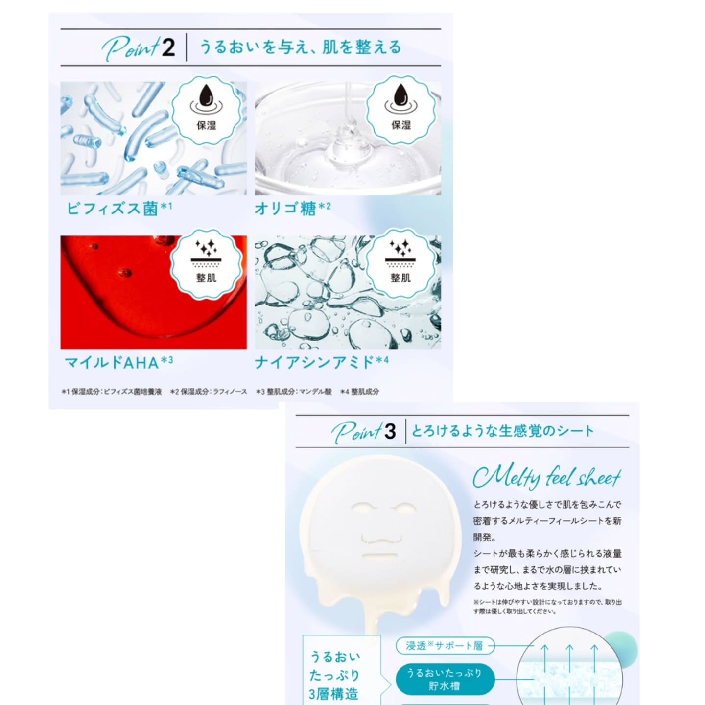 - 肌荒れ・皮脂ケア※1と健やかな肌の土台※2美容を叶える、アゼライン酸誘導体*1配合のうるおいツヤ肌管理マスクです。 肌荒れや肌の赤み、毛穴目立ちが気になる方に。 アゼライン酸*1×ナイアシンアミド*2+次世代ヒアルロン酸*3配合で、肌荒れをケアし、角質層をみずみずしいうるおいで満たします。 さらに肌表面でゆっくりと働くマイルドAHA*4が、古い角質をやわらげ、キメを整えることで、つるんとツヤめく素肌へ導きます。 シートはとろけるように肌に密着するメルティーフィールシートを採用。 シートが最も柔らかく感じられる液量を研究し、まるで水の層に包まれているような心地よさを実現しています。 (※1 ふき取りによる ※2 角質層のこと *1 肌荒れ防止成分 アゼロイルジグリシンK *2 整肌成分 *3 肌荒れ防止成分 加水分解ヒアルロン酸Na *4 整肌成分 マンデル酸)
