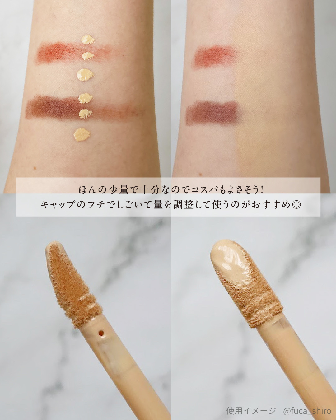コンシーラー、ファンデーション、ハイライター、シェーディング、毛穴カバー下地、美容液、日焼け止め、と7つの用途で使えるコンシーラー。 明るめのカラーはコンシーラーに、暗めのカラーはシェーディングに使うことができる!同じアイテムでベースメイクが完成できるって嬉しい。 ビッグサイズなおかげ&伸びが良いのでコンシーラーとは思えないスピードで仕上がるから時短にもなりました。