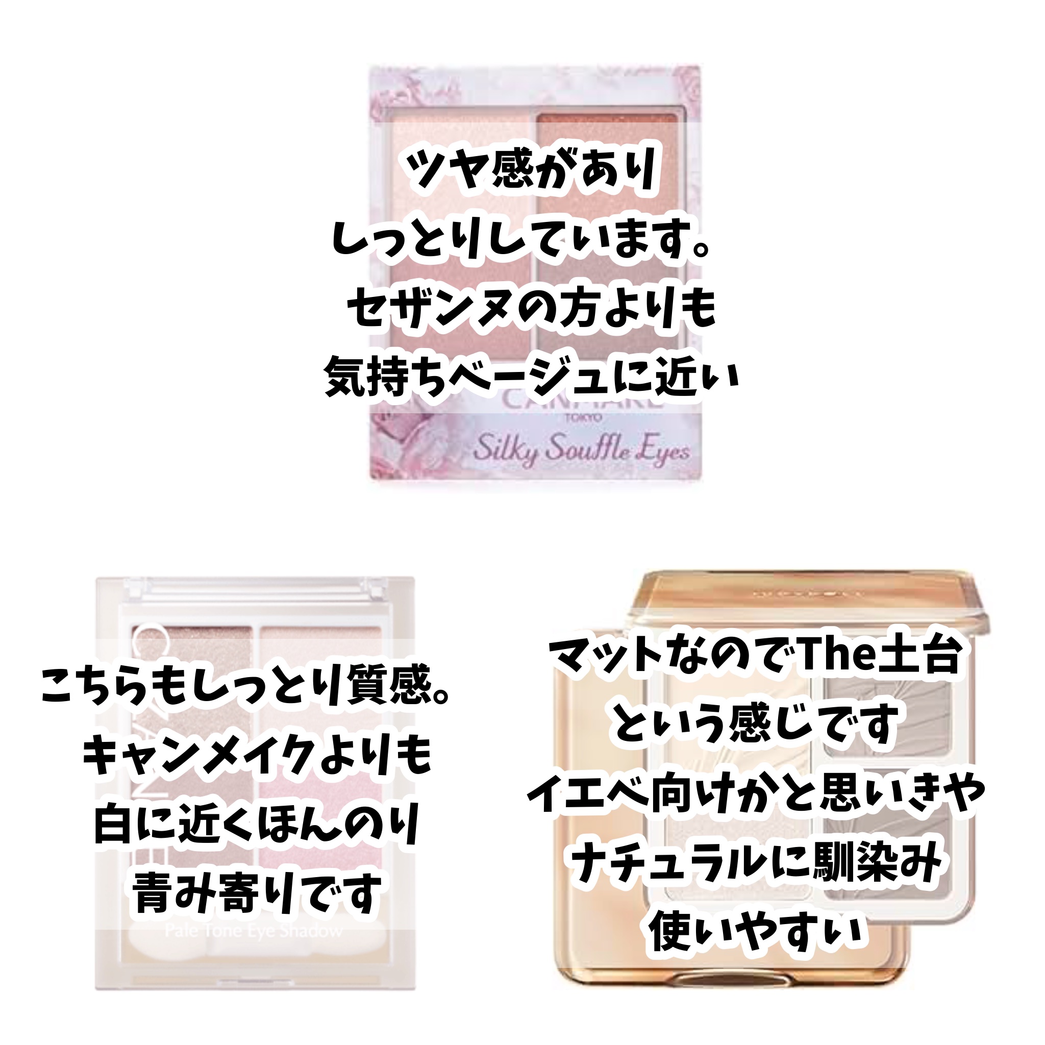 rom&nd ベターザンパレット おそらくこれが王道イエベ春パレット。10色も入っているのでその日の気分によってピンクに寄せたりブラウンに寄せたりできます。 キャンメイク シルキースフレアイズ こちらは一目惚れして購入したもの。全体的にピンク感が強めなのでセカンド夏さんぜひ! sopo アイパレット ピーチやサーモンピンク系で全体的にツヤ感があるので大人っぽい印象になります。