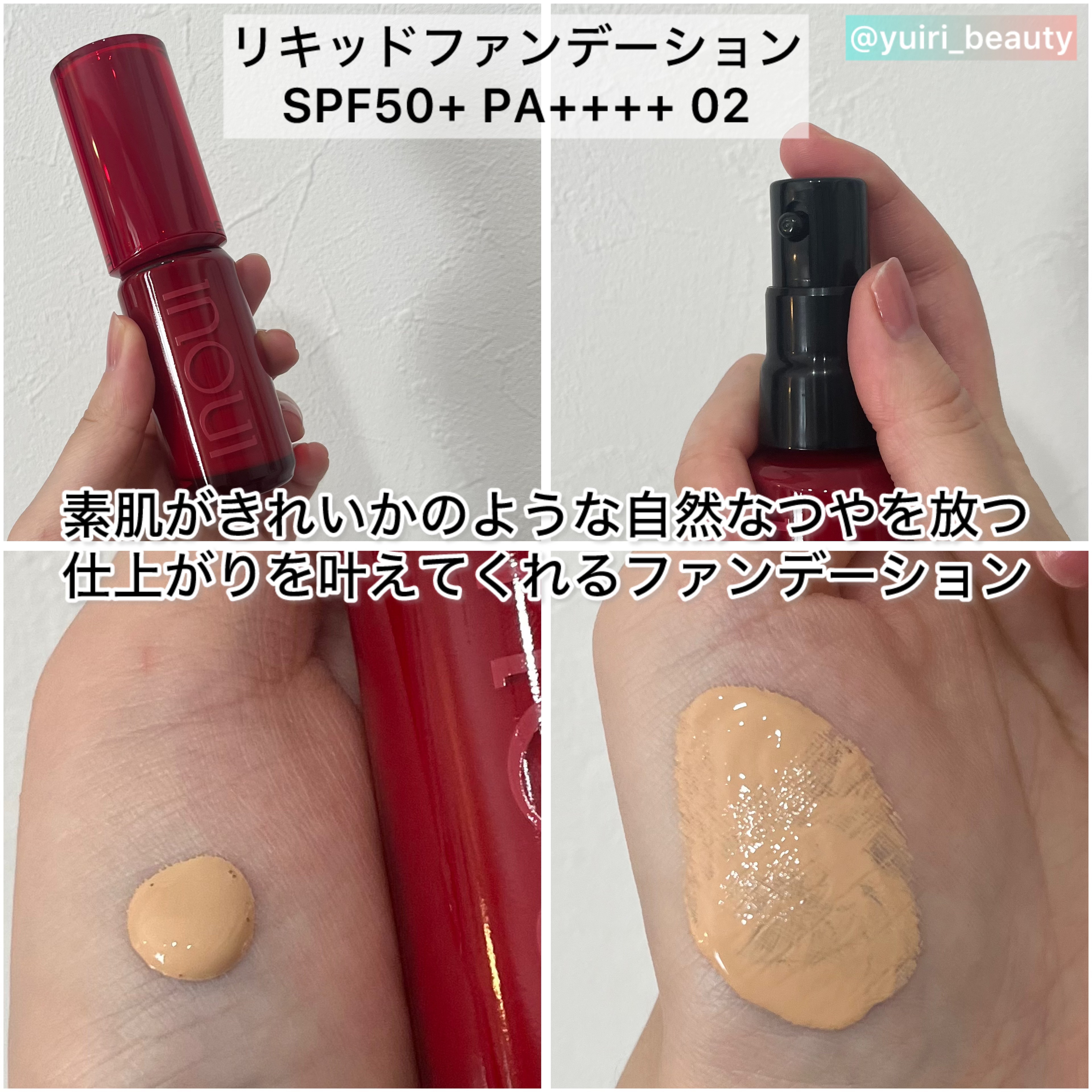 素肌そのものが綺麗かのようにみせる 【 インウイ リキッドファンデーション 】 軽やかでみずみずしく均一に伸び広がりやわらかな薄膜が肌と密着🪞 自然なつやのある仕上がりが綺麗✨ つやを効果的に感じられる使い方は、両頬、額、鼻筋など立体的なところから中心に塗り広げるのがポイントなんだって! 肌にうるおいをあたえるケア成分を70%も配合してるのも嬉しい🪄