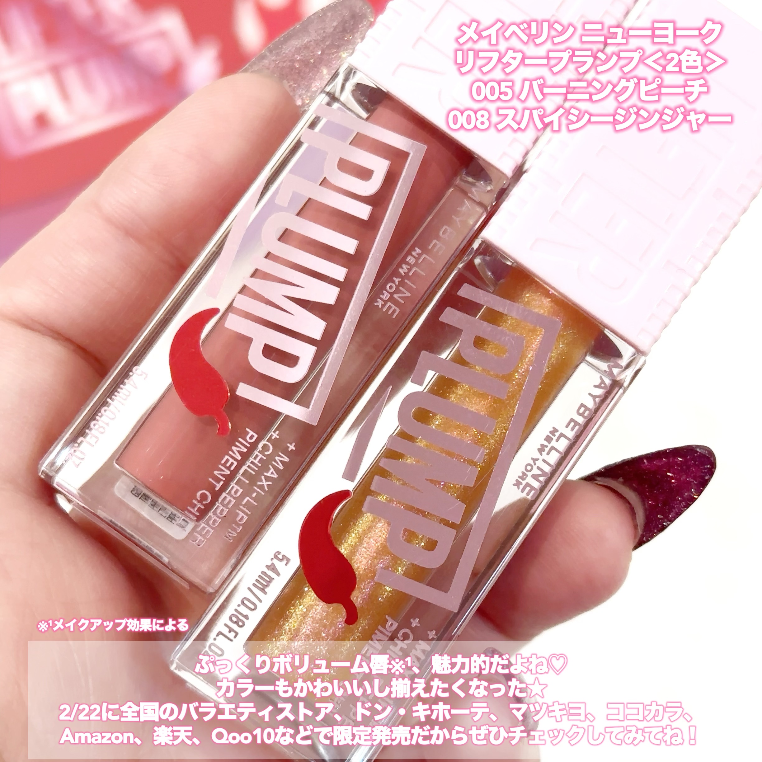刺激・辛さ・痛みが強くしっかりと唇がプランプされボリューミーに❤️ 2月22日発売 【リフタープランプ】バーニングピーチ スパイシージンジャー ¥2,189 2/22に全国のバラエティストア、ドン・キホーテ、マツキヨ、ココカラ、Amazon、楽天、Qoo10などで限定発売だよ💋