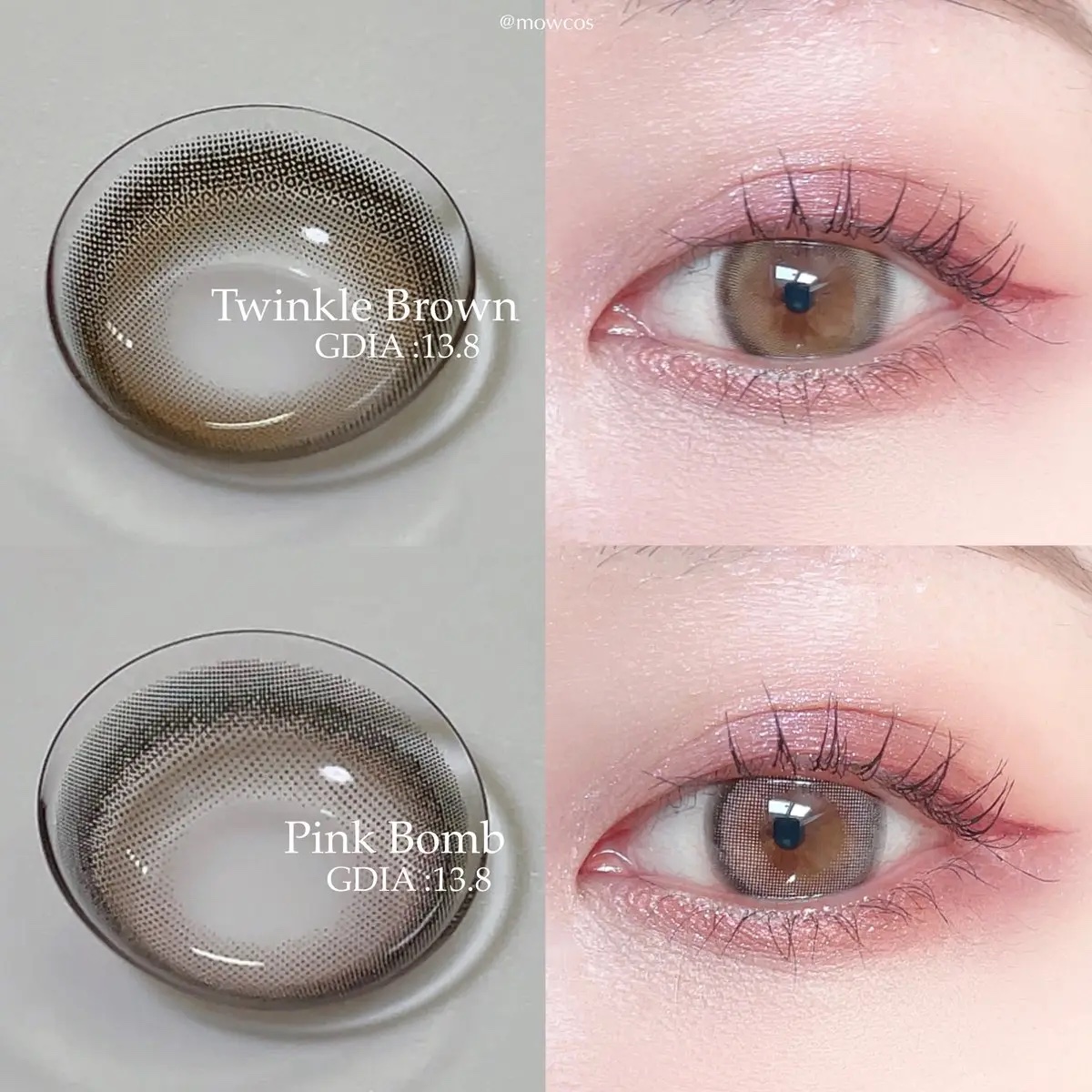 色味はほんのり明るめブラウン!ハイライトが3箇所に入ってるから回っても不自然にならない&きゅるんと感がすごい🤎 ふわっと太フチ×白っぽピンク🪄甘めな印象の瞳になるよ💞✨ 今回の新色はどちらもサイズ大きめ&デザインも華やかさのあるレンズ!写真映えしそう📸ˊ˗