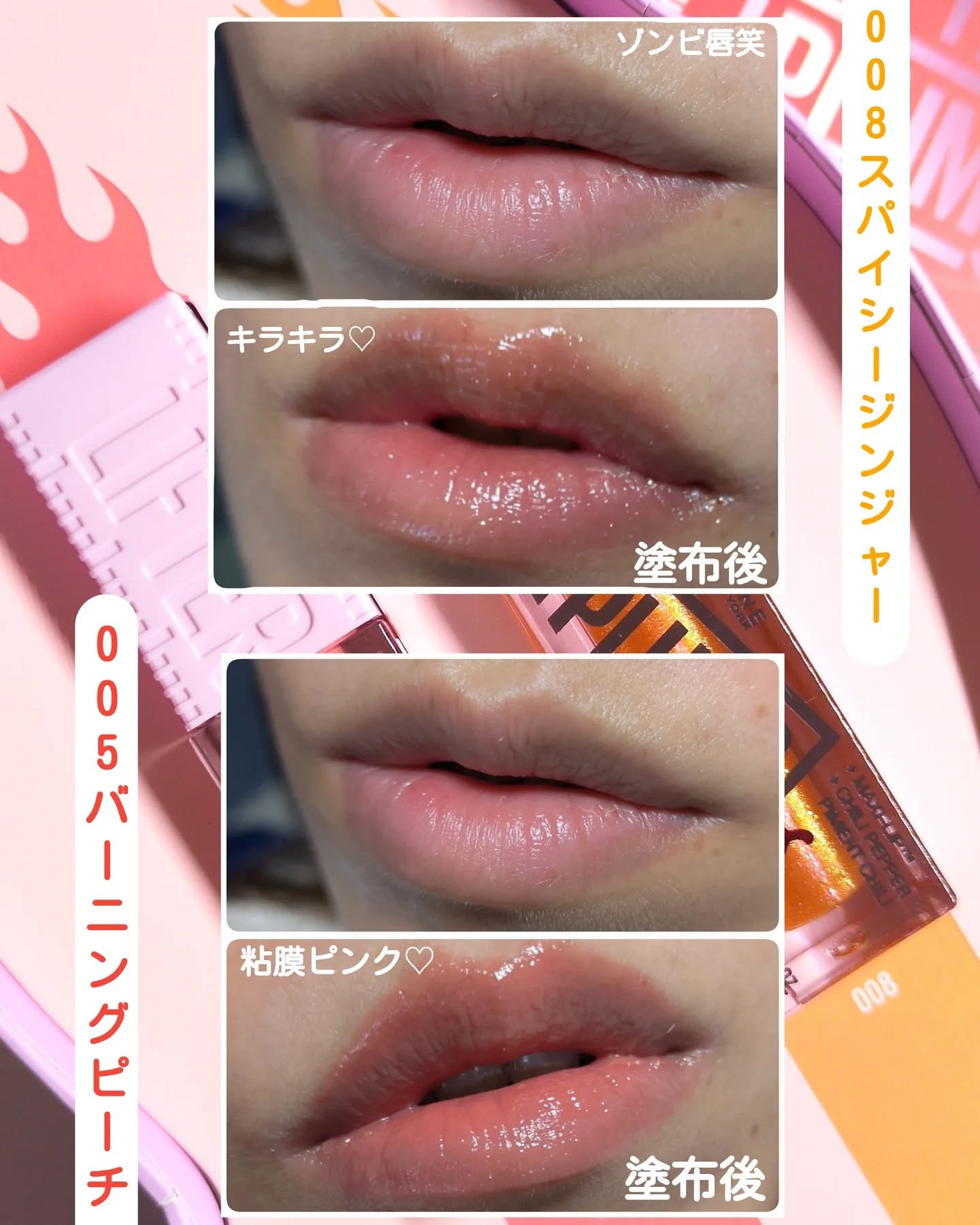 このピリピリ感、やめられない! ぷっくりボリューム唇、燃えるツヤ色── 塗ってから1分〜1分半で温かさを感じます! 色艶の良い濃い目のピンク色なので、唇の輪郭より少しオーバーめに塗ってぷるるんとしたふっくら唇にすると◎ 唐辛子成分配合、トウガラシ果実エキス🌶️ (温感を与える成分)