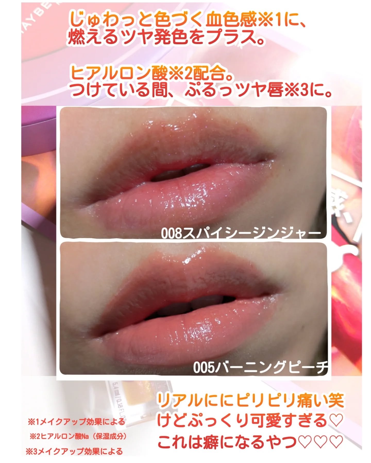 - #唐辛子*1プランパー日本初上陸*2! このピリッと感、やめられない ぷっくりボリューム唇*3、燃えるツヤ色 *1 トウガラシ果実エキス(温感を与える成分) *2 メイベリン ニューヨークにおいて *3 メイクアップ効果による
