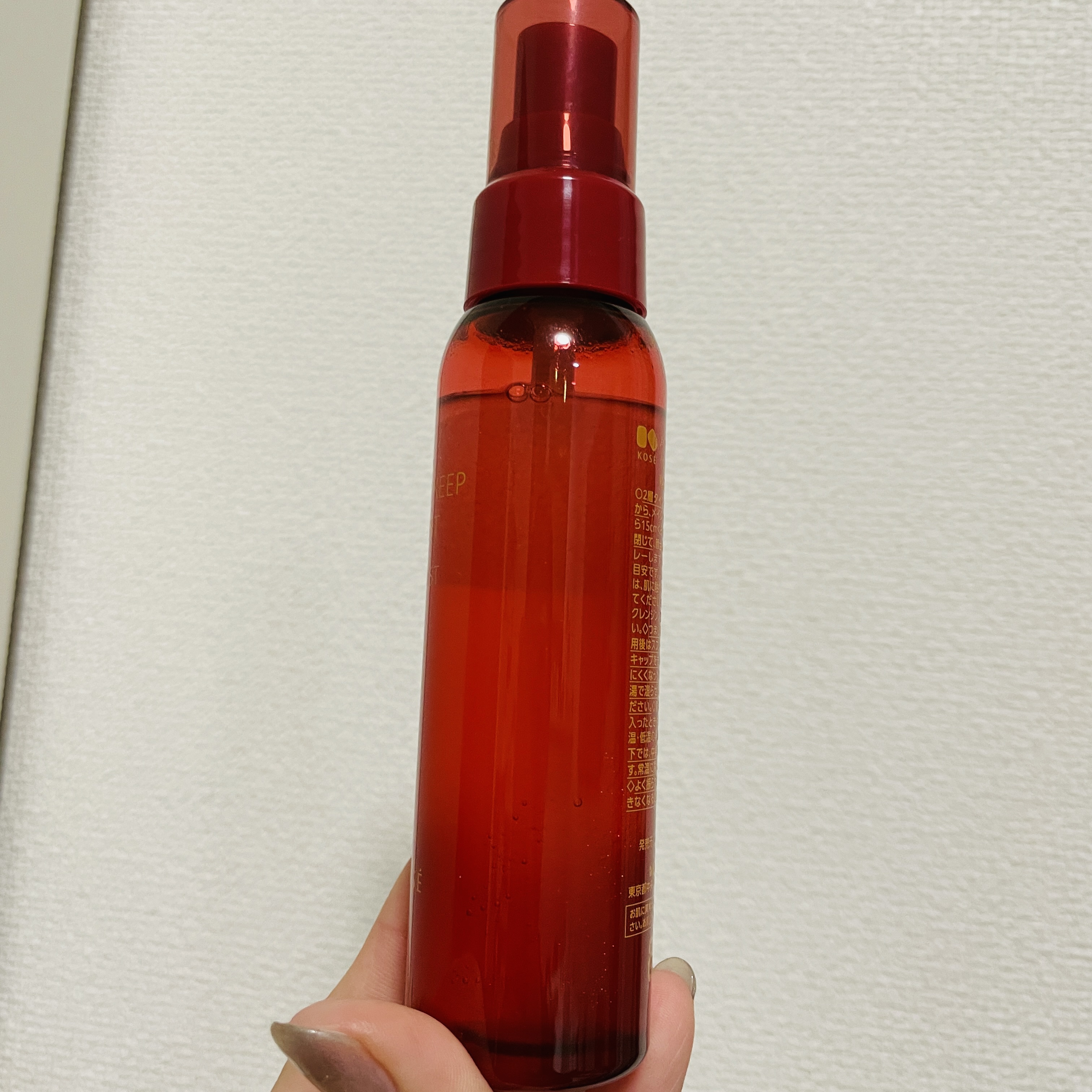 - メイク キープ ミスト EX + 長時間、化粧持ちデータ取得済み! ※当社調べ。個人差があります。 ●メイクの仕上げにシュッと吹きかけるだけで、蒸し暑い環境でも化粧くずれしにくくなるメイクキープミストです。 ●メイクよれ防止効果がプラスとなり、メイクキープ効果が衝撃パワーアップ! コーセーオリジナルの「スーパーメイクコート成分」を新配合。 表情の動きにもよれにくく高い柔軟性をもつため、 表情の変化によるメイクよれを防止。 美しい仕上がりをキープします。 ●スーパーウォータープルーフヘパワーアップ! 汗・水・涙にも強く、撥水効果を発揮します。 撥水性の高い膜が、 隙間なく均一に肌へ密着。 汗・ 水 ・ 涙をしっかりはじき、メイクくずれを防ぎます。 ●高い皮脂プルーフ効果で、 テカリ&毛穴落ち防止効果がパワーアップ! 皮脂テカリ・くずれ防止成分が皮脂をはじくと同時にテカリを防止。 テカリだけでなく、 メイクの毛穴落ちまで防ぎます。 ●高温多湿試験済み※! 蒸し暑い環境でもテカリやベタつきを防ぎ、 美しい仕上がりをキープします。 ※化粧もちに関して (コーセー調べ。 効果には個人差があります。) ●ふんわり細やかなミストが均一な1枚の膜を形成! つけたての美しいメイクを長時間キープ。 メイクをしっかり固定しながら、顔の動きに合わせて伸縮する膜を肌表面に形成。 時間が経ってもメイクがよれにくく、 美しい仕上がりが長時間持続します。 ●新配合のシカ成分をはじめとする数種の保湿成分を贅沢に配合! 肌にうるおいをあたえ、 乾燥を防ぎます。 マスク着用によるメイクのよれや、マスクへのメイク移りを防ぎます。 大気中の微粒子(ちり・ほこり・PM2.5など) からお肌をまもります。 ●アレルギーテスト済み ●ノンコメドジェニックテスト済み ※すべてのかたにアレルギーが起きない、コメド (ニキビのもと)ができないというわけではありません。 ジューシーフローラルの香り 無着色 ※スーパーメイクコート成分は(ジメチコン/ビニルトリメチルシロキシケイ酸)クロスポリマー、汗・皮脂プルーフ成分はトリメチルシロキシケイ酸、皮脂テカリ・くずれ防止成分は(ジメチコン/ビニルジメチコン)クロスポリマー、シカ成分はツボクサ葉エキス、ヒアルロン酸は加水分解ヒアルロン酸、コラーゲンは加水分解コラーゲンです。 <ご注意> 低温下では中身が白く固まりやすくなりますが、 常温に戻すために湯せんや電子レンジなどを使って高い温度で温めると品質が変化してしまいます。 さらには容器が変形・破損することで、やけどや怪我の恐れがあります。 大変危険ですので、湯せんや電子レンジなどを使って加熱することは絶対にお避けください。