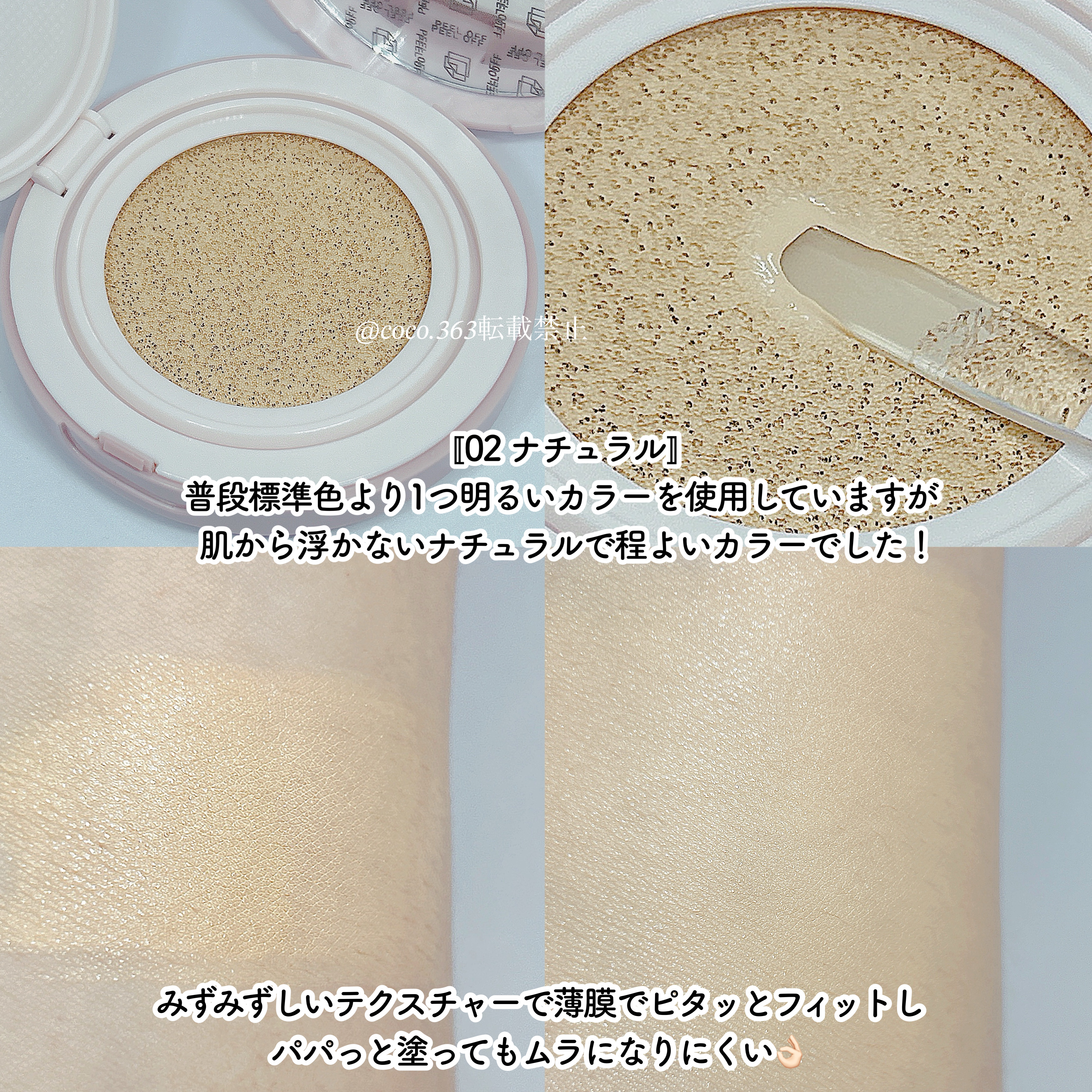 - <01 ライト> 水、酸化チタン、グリセリン、メトキシケイヒ酸エチルヘキシル、ジメチコン、サリチル酸エチルヘキシル、シクロペンタシロキサン、ジフェニルシロキシフェニルトリメチコン、フェニルトリメチコン、トリメリト酸トリトリデシル、トリメチルシロキシケイ酸、ラウリルPEG-10トリス(トリメチルシロキシ)シリルエチルジメチコン、マイカ、シクロヘキサシロキサン、1,2-ヘキサンジオール、PEG-10ジメチコン、(アクリレーツ/アクリル酸ステアリル/メタクリル酸ジメチコン)コポリマー、硫酸Mg、ジフェニルジメチコン、イソドデカン、オクチルドデカノール、ジステアルジモニウムヘクトライト、カプリル酸グリセリル、ステアリン酸、アルミナ、水酸化Al、トリエトキシカプリリルシラン、イソステアリン酸ポリグリセリル-4、エチレンジアミンジコハク酸3Na、トリイソステアリン酸イソプロピルチタン、トコフェロール、アラントイン、ダイヤモンド末、ナイアシンアミド、パール、トリ(カプリル酸/カプリン酸)グリセリル、BG、水添レシチン、マカデミア種子油、プロパンジオール、アブラナステロールズ、ツボクサエキス、レチノール、コレステロール、ラウリン酸ポリグリセリル-10、セラミドNP、ラウロイルグルタミン酸ジ(オクチルドデシル/フィトステリル/ベヘニル)、ベンジルグリコール、加水分解ムコ多糖、ヒアルロン酸Na、ステアリン酸水酸化(Al/Mg)、テトラ(ジ-t-ブチルヒドロキシヒドロケイヒ酸)ペンタエリスリチル、セチルリン酸K、キトサン、ヒアルロン酸クロスポリマーNa、加水分解ヒアルロン酸、エチルヘキシルグリセリン、クエン酸トリス(テトラメチルヒドロキシピペリジノール)、ヒアルロン酸ヒドロキシプロピルトリモニウム、ヒアルロン酸、アセチルヒアルロン酸Na、酸化鉄 <02 ナチュラル> 水、酸化チタン、グリセリン、メトキシケイヒ酸エチルヘキシル、ジメチコン、サリチル酸エチルヘキシル、シクロペンタシロキサン、ジフェニルシロキシフェニルトリメチコン、フェニルトリメチコン、トリメリト酸トリトリデシル、トリメチルシロキシケイ酸、ラウリルPEG-10トリス(トリメチルシロキシ)シリルエチルジメチコン、マイカ、シクロヘキサシロキサン、1,2-ヘキサンジオール、PEG-10ジメチコン、(アクリレーツ/アクリル酸ステアリル/メタクリル酸ジメチコン)コポリマー、硫酸Mg、ジフェニルジメチコン、イソドデカン、オクチルドデカノール、ジステアルジモニウムヘクトライト、カプリル酸グリセリル、ステアリン酸、アルミナ、水酸化Al、トリエトキシカプリリルシラン、イソステアリン酸ポリグリセリル-4、エチレンジアミンジコハク酸3Na、トリイソステアリン酸イソプロピルチタン、トコフェロール、アラントイン、ダイヤモンド末、ナイアシンアミド、パール、トリ(カプリル酸/カプリン酸)グリセリル、BG、水添レシチン、マカデミア種子油、プロパンジオール、アブラナステロールズ、ツボクサエキス、レチノール、コレステロール、ラウリン酸ポリグリセリル-10、セラミドNP、ラウロイルグルタミン酸ジ(オクチルドデシル/フィトステリル/ベヘニル)、ベンジルグリコール、加水分解ムコ多糖、ヒアルロン酸Na、ステアリン酸水酸化(Al/Mg)、テトラ(ジ-t-ブチルヒドロキシヒドロケイヒ酸)ペンタエリスリチル、セチルリン酸K、キトサン、ヒアルロン酸クロスポリマーNa、加水分解ヒアルロン酸、エチルヘキシルグリセリン、クエン酸トリス(テトラメチルヒドロキシピペリジノール)、ヒアルロン酸ヒドロキシプロピルトリモニウム、ヒアルロン酸、アセチルヒアルロン酸Na、酸化鉄 <03 ピンクナチュラル> 水、酸化チタン、グリセリン、メトキシケイヒ酸エチルヘキシル、ジメチコン、サリチル酸エチルヘキシル、シクロペンタシロキサン、ジフェニルシロキシフェニルトリメチコン、フェニルトリメチコン、トリメリト酸トリトリデシル、トリメチルシロキシケイ酸、ラウリルPEG-10トリス(トリメチルシロキシ)シリルエチルジメチコン、マイカ、シクロヘキサシロキサン、1,2-ヘキサンジオール、PEG-10ジメチコン、(アクリレーツ/アクリル酸ステアリル/メタクリル酸ジメチコン)コポリマー、硫酸Mg、イソドデカン、オクチルドデカノール、ジフェニルジメチコン、ジステアルジモニウムヘクトライト、カプリル酸グリセリル、ステアリン酸、アルミナ、水酸化Al、トリエトキシカプリリルシラン、イソステアリン酸ポリグリセリル-4、エチレンジアミンジコハク酸3Na、トリイソステアリン酸イソプロピルチタン、トコフェロール、アラントイン、ダイヤモンド末、ナイアシンアミド、パール、トリ(カプリル酸/カプリン酸)グリセリル、BG、水添レシチン、マカデミア種子油、プロパンジオール、アブラナステロールズ、ツボクサエキス、レチノール、コレステロール、ラウリン酸ポリグリセリル-10、セラミドNP、ラウロイルグルタミン酸ジ(オクチルドデシル/フィトステリル/ベヘニル)、ベンジル