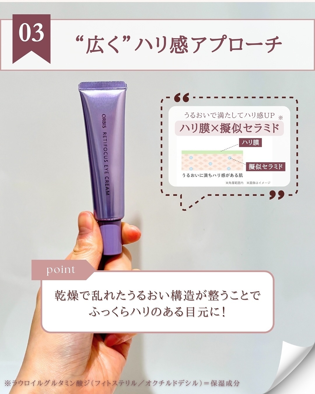 - 肌隅々まで*1 、広くハリ感で満たす 高浸透 *2 ピュアレチノール *3 配合 2 段階ハリ注入 *2 アイクリームが誕生 『オルビス レチフォーカス アイクリーム』は、悩みが加速する目元ならではの環境に着目した“隅々まで・広く”の「2 段階ハリ注入*2」を採用しました。「隅々まで」のアプローチとしては、浸透力*2が高い「高浸透ピュアレチノール*3」を配合。年齢を重ねることや摩擦による乾燥などでハリ感・弾力感が低下してしまう目元へ、押し返すようなハリ感を与えてくれます。また、「広く」のアプローチとしては、ハリ膜が広く伸び広がることや、「疑似セラミド*4」を配合することで押し上げるようなハリ感をサポートします。さらに、マルチな目元悩みケアのために、乾燥やくすみ*5といった悩みに対応した保湿成分も配合し、乾燥による小じわを目立たなくします*6。肌にぴったり密着して目元集中ケアを叶える、こっくり濃密テクスチャーがハリ感みなぎるふっくら質感の目元へ導きます。 *1 角層の範囲内 *2 角層まで *3 レチノール=保湿成分 *4 ラウロイルグルタミン酸ジ(フィトステリル/オクチルドデシル) =保湿成分 *5 乾燥による *6 効能評価試験済み