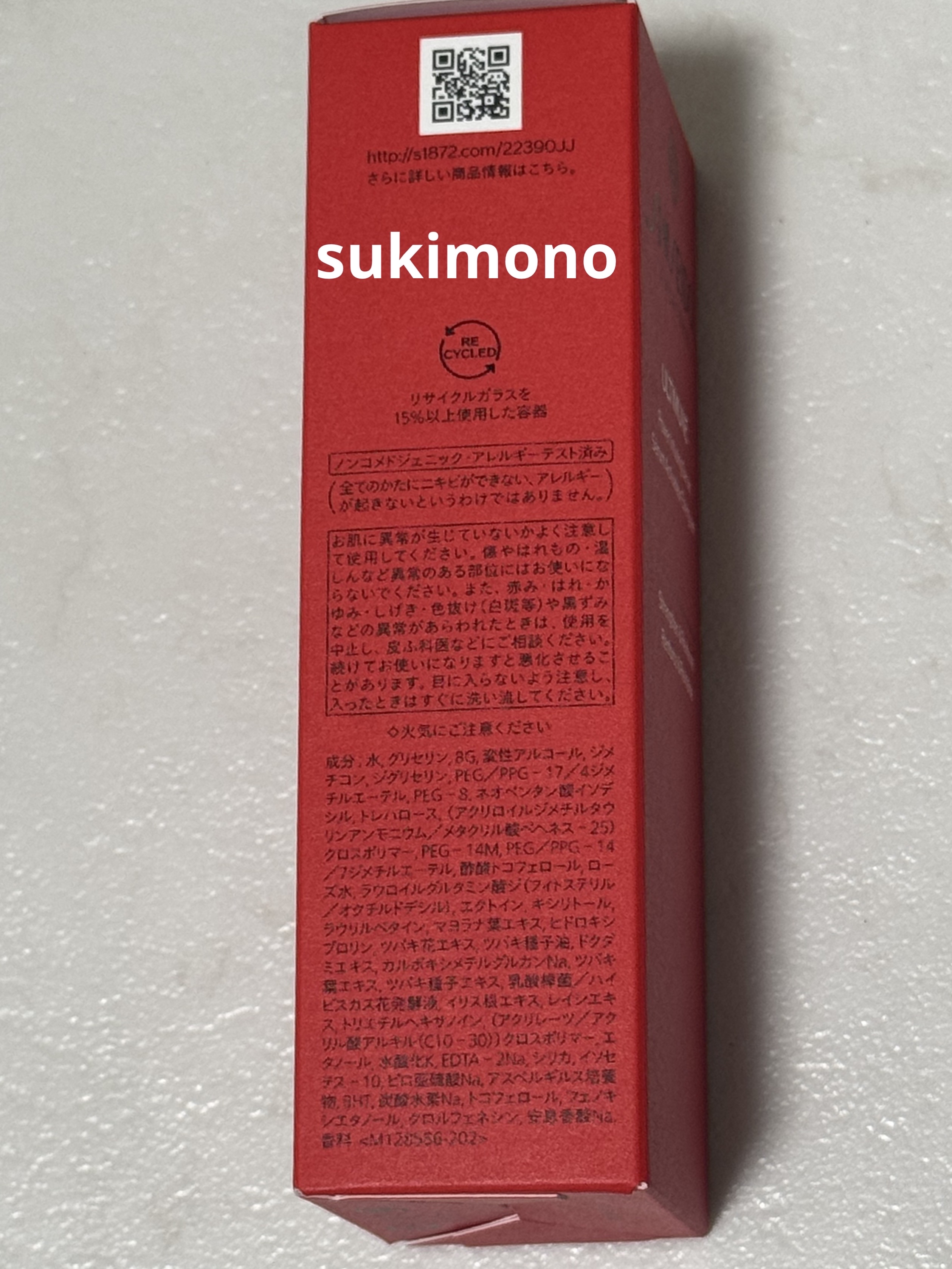 - <30mL> 水、グリセリン、BG、変性アルコール、ジメチコン、ジグリセリン、PEG/PPG-17/4ジメチルエーテル、PEG-8、ネオペンタン酸イソデシル、トレハロース、(アクリロイルジメチルタウリンアンモニウム/メタクリル酸ベヘネス-25)クロスポリマー、PEG-14M、PEG/PPG-14/7ジメチルエーテル、酢酸トコフェロール、ローズ水、ラウロイルグルタミン酸ジ(フィトステリル/オクチルドデシル)、エクトイン、キシリトール、ラウリルベタイン、マヨラナ葉エキス、ヒドロキシプロリン、ツバキ花エキス、ツバキ種子油、ドクダミエキス、カルボキシメチルグルカンNa、ツバキ葉エキス、ツバキ種子エキス、乳酸桿菌/ハイビスカス花発酵液、イリス根エキス、レイシエキス、トリエチルヘキサノイン、(アクリレーツ/アクリル酸アルキル(C10-30))クロスポリマー、エタノール、水酸化K、EDTA-2Na、シリカ、イソセテス-10、ピロ亜硫酸Na、アスペルギルス培養物、BHT、炭酸水素Na、トコフェロール、フェノキシエタノール、クロルフェネシン、安息香酸Na、香料 <50mL> 水、グリセリン、BG、変性アルコール、ジメチコン、ジグリセリン、PEG/PPG-17/4ジメチルエーテル、PEG-8、ネオペンタン酸イソデシル、トレハロース、(アクリロイルジメチルタウリンアンモニウム/メタクリル酸ベヘネス-25)クロスポリマー、PEG-14M、PEG/PPG-14/7ジメチルエーテル、酢酸トコフェロール、ローズ水、ラウロイルグルタミン酸ジ(フィトステリル/オクチルドデシル)、エクトイン、キシリトール、ラウリルベタイン、マヨラナ葉エキス、ヒドロキシプロリン、ツバキ花エキス、ツバキ種子油、ドクダミエキス、カルボキシメチルグルカンNa、ツバキ葉エキス、ツバキ種子エキス、乳酸桿菌/ハイビスカス花発酵液、イリス根エキス、レイシエキス、トリエチルヘキサノイン、(アクリレーツ/アクリル酸アルキル(C10-30))クロスポリマー、エタノール、水酸化K、EDTA-2Na、シリカ、イソセテス-10、ピロ亜硫酸Na、アスペルギルス培養物、BHT、炭酸水素Na、トコフェロール、フェノキシエタノール、クロルフェネシン、安息香酸Na、香料 <50mL(レフィル)> 水、グリセリン、BG、変性アルコール、ジメチコン、ジグリセリン、PEG/PPG-17/4ジメチルエーテル、PEG-8、ネオペンタン酸イソデシル、トレハロース、(アクリロイルジメチルタウリンアンモニウム/メタクリル酸ベヘネス-25)クロスポリマー、PEG-14M、PEG/PPG-14/7ジメチルエーテル、酢酸トコフェロール、ローズ水、ラウロイルグルタミン酸ジ(フィトステリル/オクチルドデシル)、エクトイン、キシリトール、ラウリルベタイン、マヨラナ葉エキス、ヒドロキシプロリン、ツバキ花エキス、ツバキ種子油、ドクダミエキス、カルボキシメチルグルカンNa、ツバキ葉エキス、ツバキ種子エキス、乳酸桿菌/ハイビスカス花発酵液、イリス根エキス、レイシエキス、トリエチルヘキサノイン、(アクリレーツ/アクリル酸アルキル(C10-30))クロスポリマー、エタノール、水酸化K、EDTA-2Na、シリカ、イソセテス-10、ピロ亜硫酸Na、アスペルギルス培養物、BHT、炭酸水素Na、トコフェロール、フェノキシエタノール、クロルフェネシン、安息香酸Na、香料 <75mL> 水、グリセリン、BG、変性アルコール、ジメチコン、ジグリセリン、PEG/PPG-17/4ジメチルエーテル、PEG-8、ネオペンタン酸イソデシル、トレハロース、(アクリロイルジメチルタウリンアンモニウム/メタクリル酸ベヘネス-25)クロスポリマー、PEG-14M、PEG/PPG-14/7ジメチルエーテル、酢酸トコフェロール、ローズ水、ラウロイルグルタミン酸ジ(フィトステリル/オクチルドデシル)、エクトイン、キシリトール、ラウリルベタイン、マヨラナ葉エキス、ヒドロキシプロリン、ツバキ花エキス、ツバキ種子油、ドクダミエキス、カルボキシメチルグルカンNa、ツバキ葉エキス、ツバキ種子エキス、乳酸桿菌/ハイビスカス花発酵液、イリス根エキス、レイシエキス、トリエチルヘキサノイン、(アクリレーツ/アクリル酸アルキル(C10-30))クロスポリマー、エタノール、水酸化K、EDTA-2Na、シリカ、イソセテス-10、ピロ亜硫酸Na、アスペルギルス培養物、BHT、炭酸水素Na、トコフェロール、フェノキシエタノール、クロルフェネシン、安息香酸Na、香料
