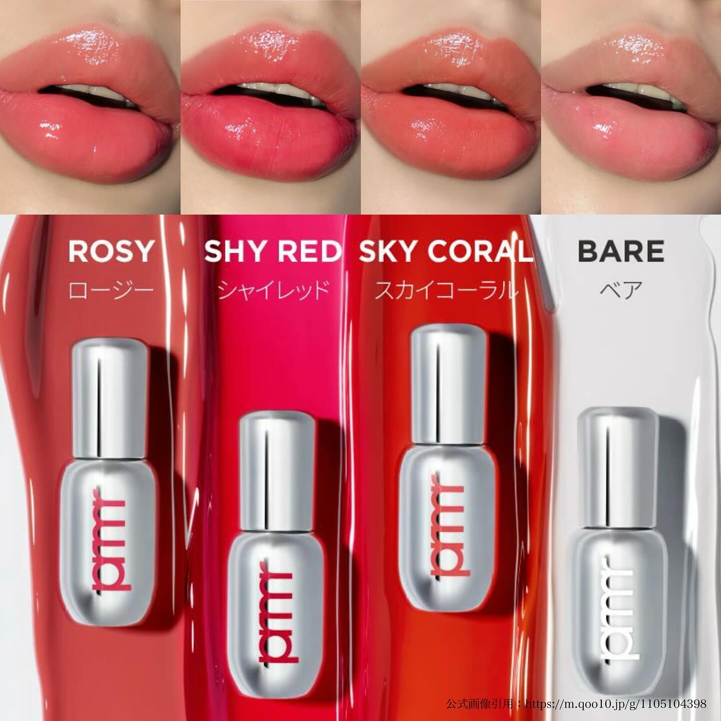 - <ロージー> 水添ポリ(C6-14オレフィン)、水添ポリイソブテン、トリ(カプリル酸/カプリン酸)グリセリル、(エチレン/プロピレン/スチレン)コポリマー、酢酸トコフェロール、ダイズ油、パルマローザ油、ニオイテンジクアオイ花油、ヒマシ油、ホホバ種子油、ローズマリー葉油、ダマスクバラ花油、オレンジ果皮エキス、テトラヘキシルデカン酸アスコルビル、レチノール、セラミドNP、ダイズポリペプチド、乳酸桿菌培養溶解質、加水分解エクステンシン、ヒアルロン酸Na、加水分解ヒアルロン酸、ヒアルロン酸クロスポリマーNa、ヒアルロン酸、アセチルヒアルロン酸Na、エチルヘキシルグリセリン、トリイソステアリン酸ポリグリセリル-2、ラウリン酸ポリグリセリル-10、(ブチレン/エチレン/スチレン)コポリマー、テトラ(ジ-t-ブチルヒドロキシヒドロケイヒ酸)ペンタエリスリチル、水、水酸化Al、トリエトキシカプリリルシラン、グリセリン、プロパンジオール、BG、1,2-ヘキサンジオール、水添レシチン、トコフェロール、メントキシプロパンジオール、マンダリンオレンジ果皮油、ベルガモット果実油、パチョリ油、カミツレ花油、ラベンダー油、酸化チタン、酸化鉄、赤201、赤202 <ベア> 水添ポリ(C6-14オレフィン)、水添ポリイソブテン、トリ(カプリル酸/カプリン酸)グリセリル、(エチレン/プロピレン/スチレン)コポリマー、酢酸トコフェロール、ヒマワリ種子油、ダイズ油、パルマローザ油、ニオイテンジクアオイ花油、ヒマシ油、ローズマリー葉油、ホホバ種子油、ダマスクバラ花油、ニンジン根エキス、オレンジ果皮エキス、レチノール、β-カロチン、セラミドNP、ダイズポリペプチド、乳酸桿菌培養溶解質、ヒアルロン酸Na、加水分解エクステンシン、ラウリン酸ポリグリセリル-10、ヒアルロン酸クロスポリマーNa、加水分解ヒアルロン酸、ヒアルロン酸、アセチルヒアルロン酸Na、テトラヘキシルデカン酸アスコルビル、エチルヘキシルグリセリン、(ブチレン/エチレン/スチレン)コポリマー、グリセリン、BG、水、プロパンジオール、1,2-ヘキサンジオール、トコフェロール、テトラ(ジ-t-ブチルヒドロキシヒドロケイヒ酸)ペンタエリスリチル、水添レシチン、メントキシプロパンジオール、マンダリンオレンジ果皮油、ベルガモット果実油、パチョリ油、カミツレ花油、ラベンダー油 <スカイコーラル> 水添ポリ(C6-14オレフィン)、水添ポリイソブテン、トリ(カプリル酸/カプリン酸)グリセリル、(エチレン/プロピレン/スチレン)コポリマー、酢酸トコフェロール、ダイズ油、パルマローザ油、ニオイテンジクアオイ花油、ヒマシ油、ホホバ種子油、ローズマリー葉油、ダマスクバラ花油、オレンジ果皮エキス、テトラヘキシルデカン酸アスコルビル、レチノール、セラミドNP、ダイズポリペプチド、乳酸桿菌培養溶解質、加水分解エクステンシン、ヒアルロン酸Na、加水分解ヒアルロン酸、ヒアルロン酸クロスポリマーNa、ヒアルロン酸、アセチルヒアルロン酸Na、エチルヘキシルグリセリン、トリイソステアリン酸ポリグリセリル-2、ラウリン酸ポリグリセリル-10、(ブチレン/エチレン/スチレン)コポリマー、テトラ(ジ-t-ブチルヒドロキシヒドロケイヒ酸)ペンタエリスリチル、水、グリセリン、プロパンジオール、BG、1,2-ヘキサンジオール、水添レシチン、トコフェロール、メントキシプロパンジオール、マンダリンオレンジ果皮油、ベルガモット果実油、パチョリ油、カミツレ花油、ラベンダー油、酸化チタン、酸化鉄、赤226、黄5 <シャイレッド> 水添ポリ(C6-14オレフィン)、水添ポリイソブテン、トリ(カプリル酸/カプリン酸)グリセリル、(エチレン/プロピレン/スチレン)コポリマー、酢酸トコフェロール、ダイズ油、パルマローザ油、ニオイテンジクアオイ花油、ヒマシ油、ホホバ種子油、ローズマリー葉油、ダマスクバラ花油、オレンジ果皮エキス、テトラヘキシルデカン酸アスコルビル、レチノール、セラミドNP、ダイズポリペプチド、乳酸桿菌培養溶解質、加水分解エクステンシン、ヒアルロン酸Na、加水分解ヒアルロン酸、ヒアルロン酸クロスポリマーNa、ヒアルロン酸、アセチルヒアルロン酸Na、エチルヘキシルグリセリン、トリイソステアリン酸ポリグリセリル-2、ラウリン酸ポリグリセリル-10、(ブチレン/エチレン/スチレン)コポリマー、テトラ(ジ-t-ブチルヒドロキシヒドロケイヒ酸)ペンタエリスリチル、水、グリセリン、プロパンジオール、BG、1,2-ヘキサンジオール、水添レシチン、トコフェロール、メントキシプロパンジオール、マンダリンオレンジ果皮油、ベルガモット果実油、パチョリ油、カミツレ花油、ラベンダー油、赤202、黄5