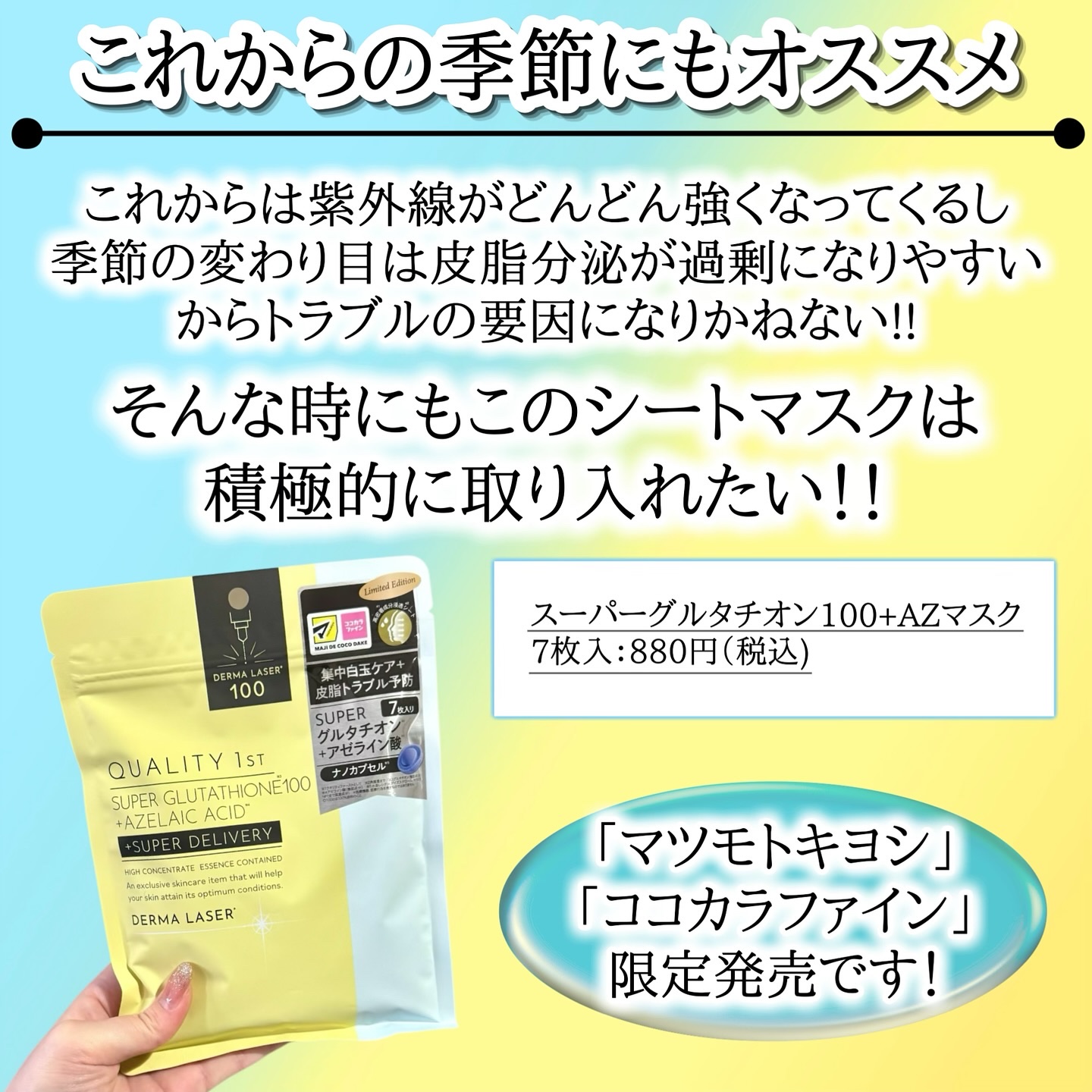 クオリティファーストスーパーグルタチオン100+アゼライン酸\\マツキヨ&ココカラ限定//集中白玉ケア+皮脂トラブル予防が1枚3分で毎日ケア出来るシートマスク.ᐟ.ᐟ肌なじみがいい水添レシチン*のカプセルが角質層に浸透しお肌にうるおいを与える...