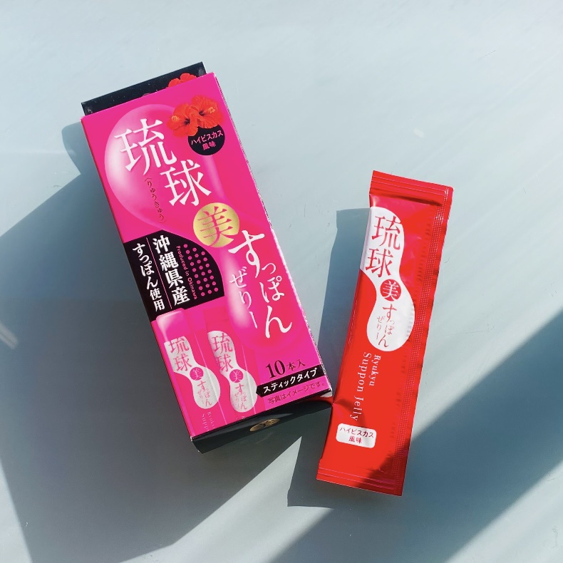 沖縄生まれのすっぽんぜりーは、コラーゲン・アミノ酸19種・ミネラル・不飽和脂肪酸・ビタミンB群などが手軽に摂れる、スティックタイプのゼリーだよ! 沖縄県産のすっぽんを使用していて、キレイと健康維持の成分がたっぷりはいってるんだって! 華やかな味わいの「ハイビスカス風味」は甘酸っぱくておいしい♡