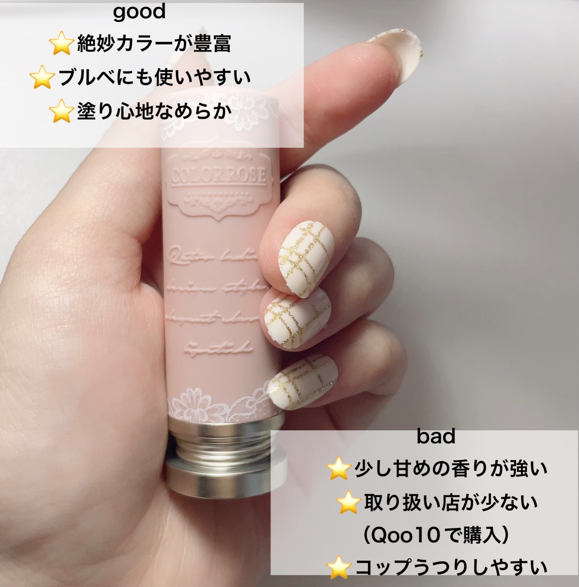 ツヤツヤキレイ✴️みずみずしさが感じられるのでどのカラーにしても春夏がとくにオススメ カラバリが豊富!必ずお気に入りが見つかる。シーズンごとに4本くらいのペースで新色が出るためつい揃えたくなる! 色持ちが色によって異なる。ヌーディーカラーシリーズはとくに色もちが△