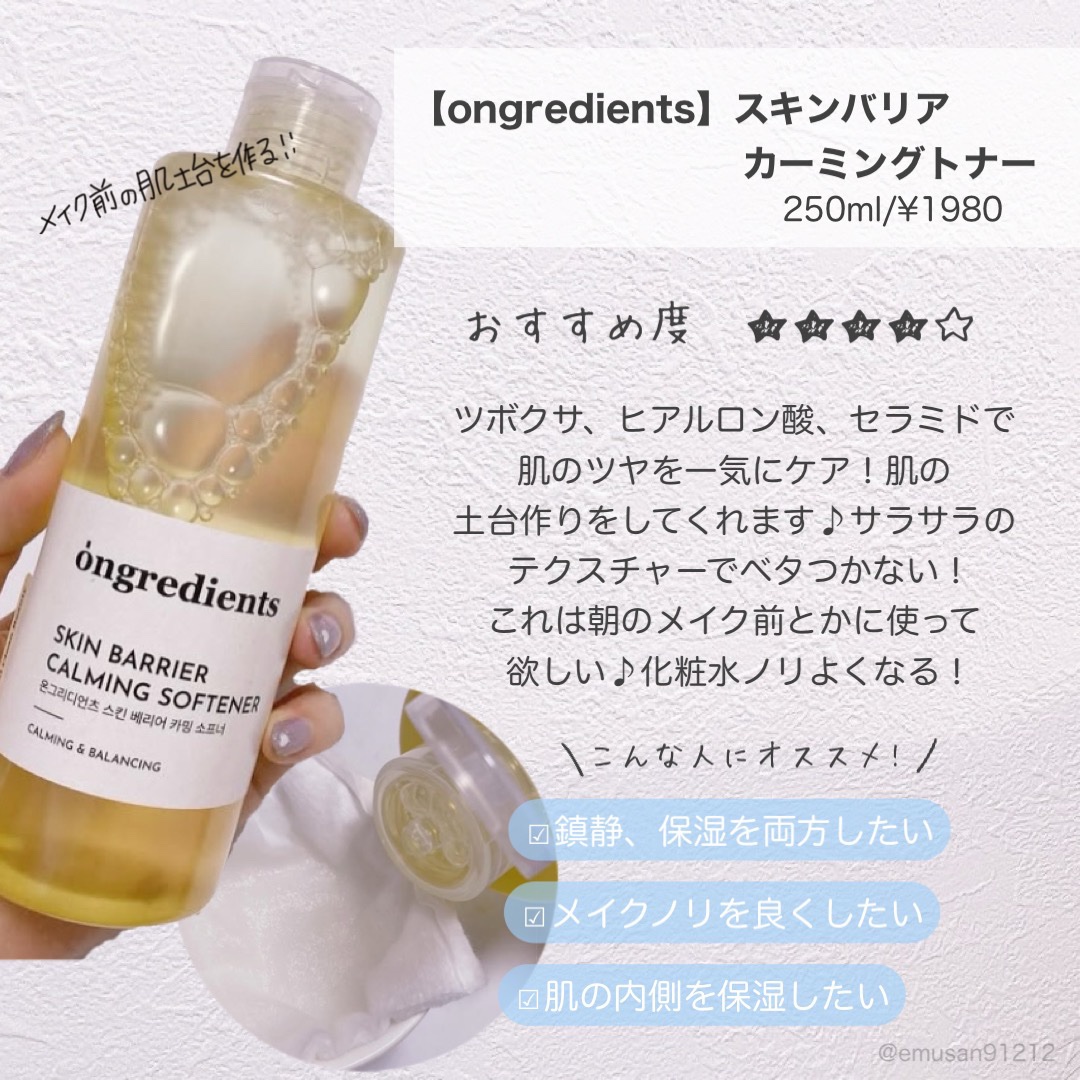 Ongredients オングリディエンツ スキンバリアカーミングソフナー | 1,980円 |