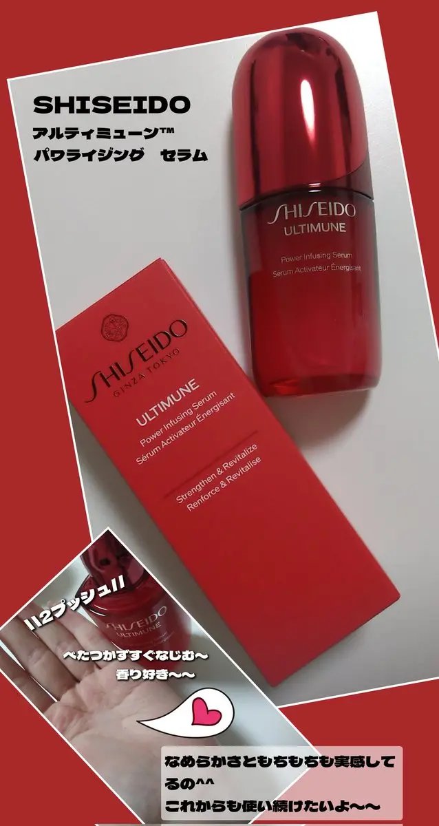 アルティミューンだけは毎日欠かさず使っていて、現行品はすでに4本使い切ったくらいお気に入りの美容液なの! 新成分の発酵カメリアエキス配合でうるおいに満ちた肌へ導いてくれるそう✨ 塗った後はこれだけでパーンとしてモチモチなハリのある肌になるからお手入れの時間が楽しい。