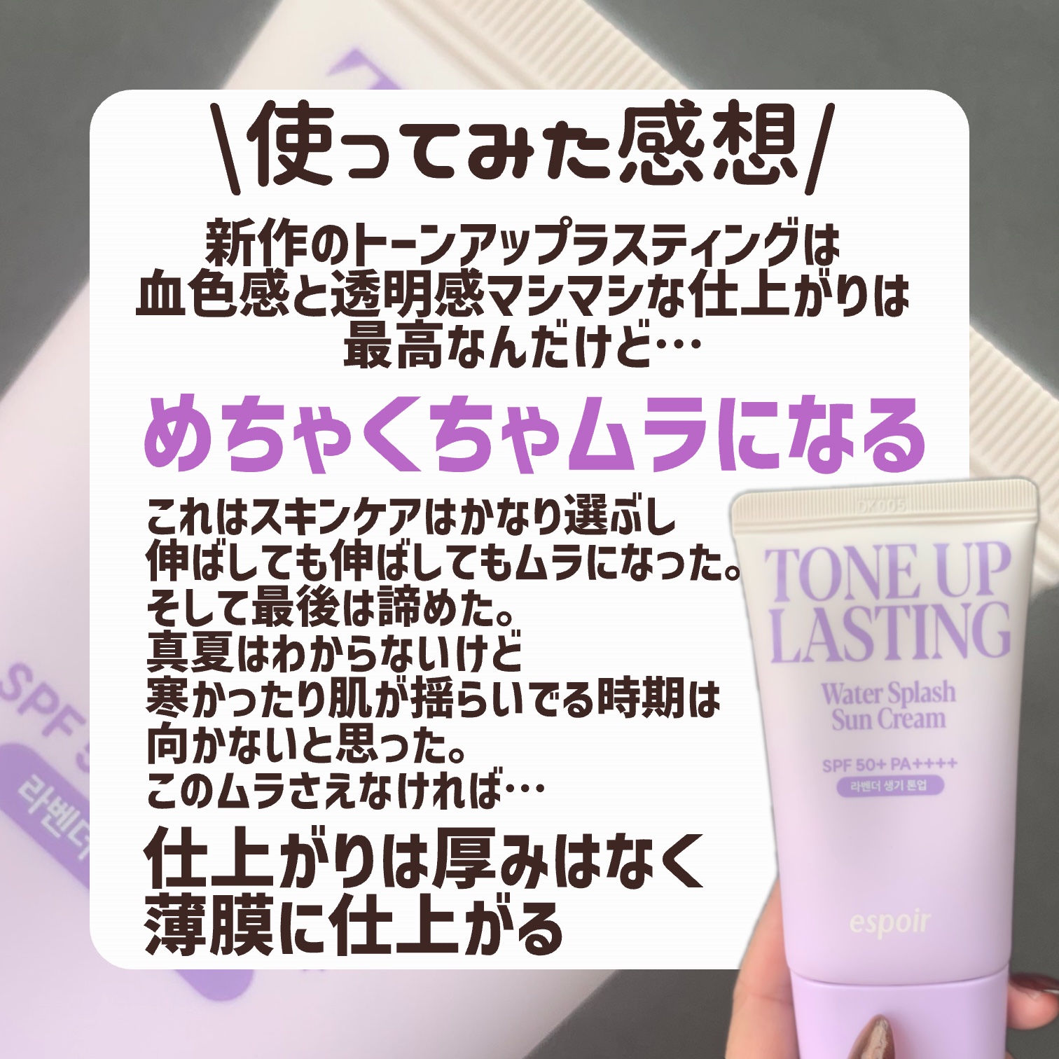 🤍espoir🤍✔️ウォータースプラッシュサンクリームトーンアップラスティング+24時間しっかり肌に密着しトーンアップをキープ!+ベビーラベンダーカラーが黄みも赤みもしっかりカバー!+SPF50+PA++++、安心のウォータープルーフ!!+ま...