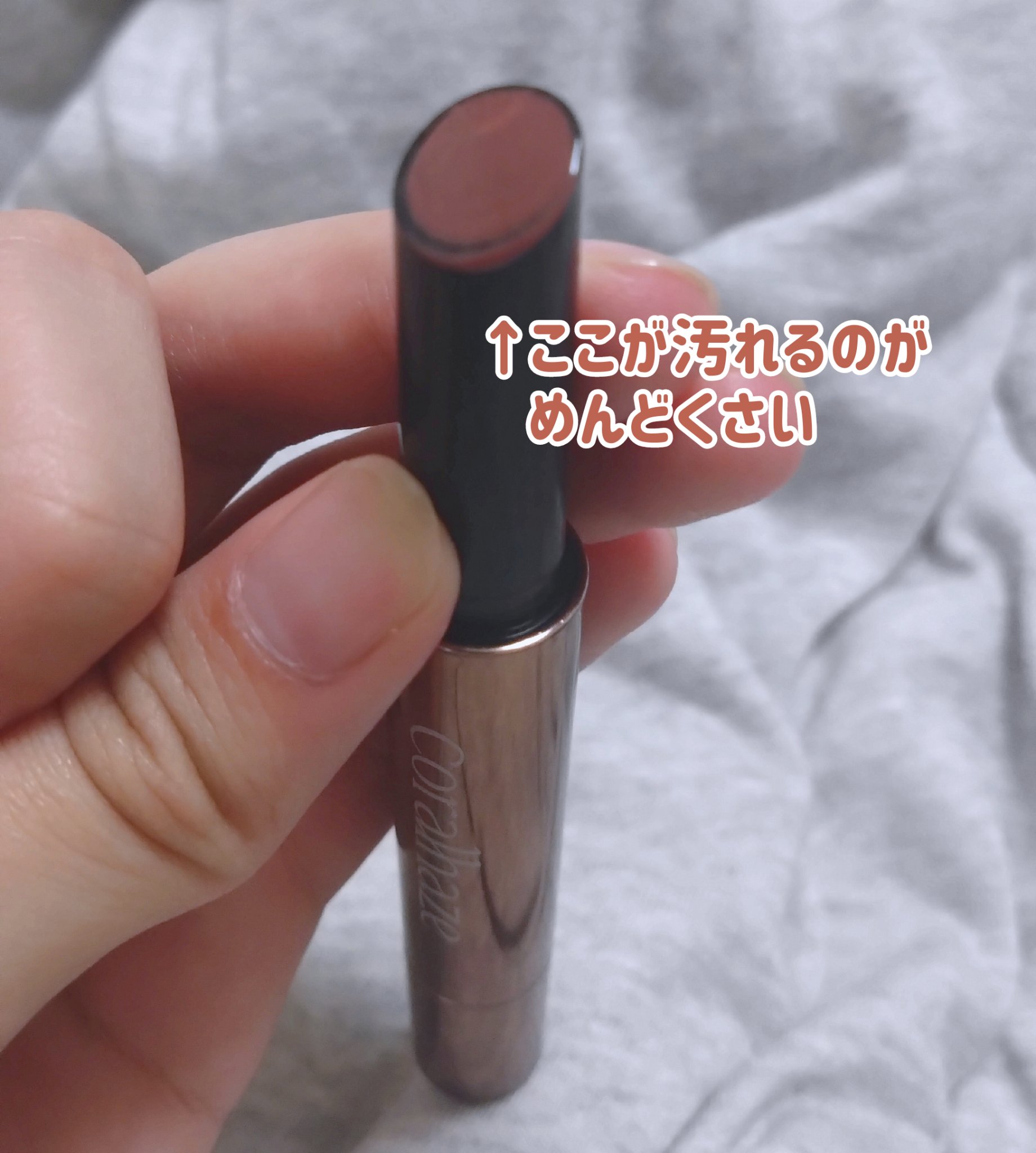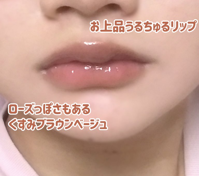 ミルキーな色素薄い系のくすみベージュ。透け感が強いのでもとの唇の色が濃い方は白浮きしちゃうかもです😿 水分感の強いうるちゅるタンフルリップ!🍬 色味がとにかくかわいい!ツヤ感も綺麗だしわりと持つのでおすすめです! 時間が経つと唇の内側の皮が白くなってしまう;;こまめにメイク直しができれば大丈夫なのですがバイト中なんかは白くなってしまいました;;