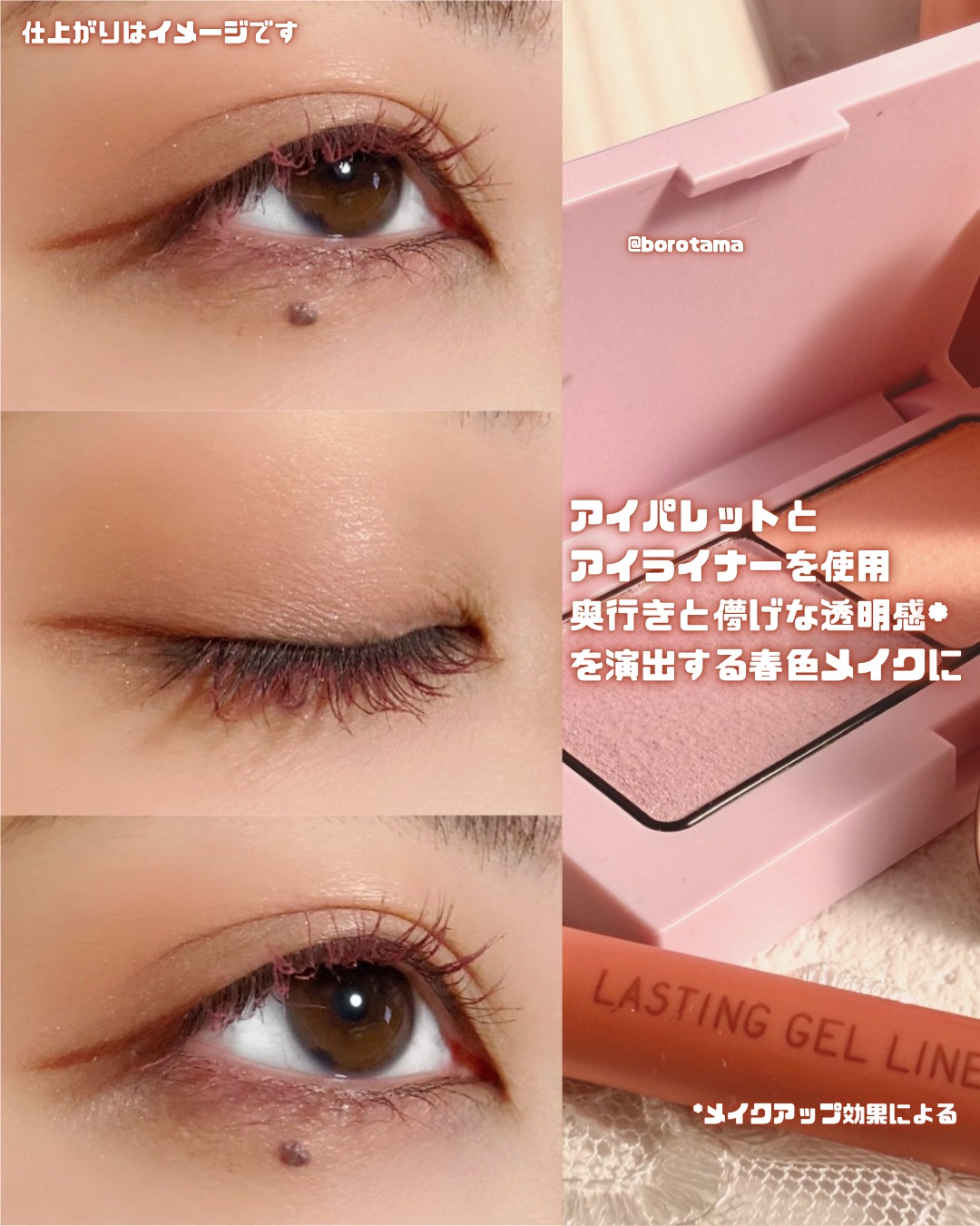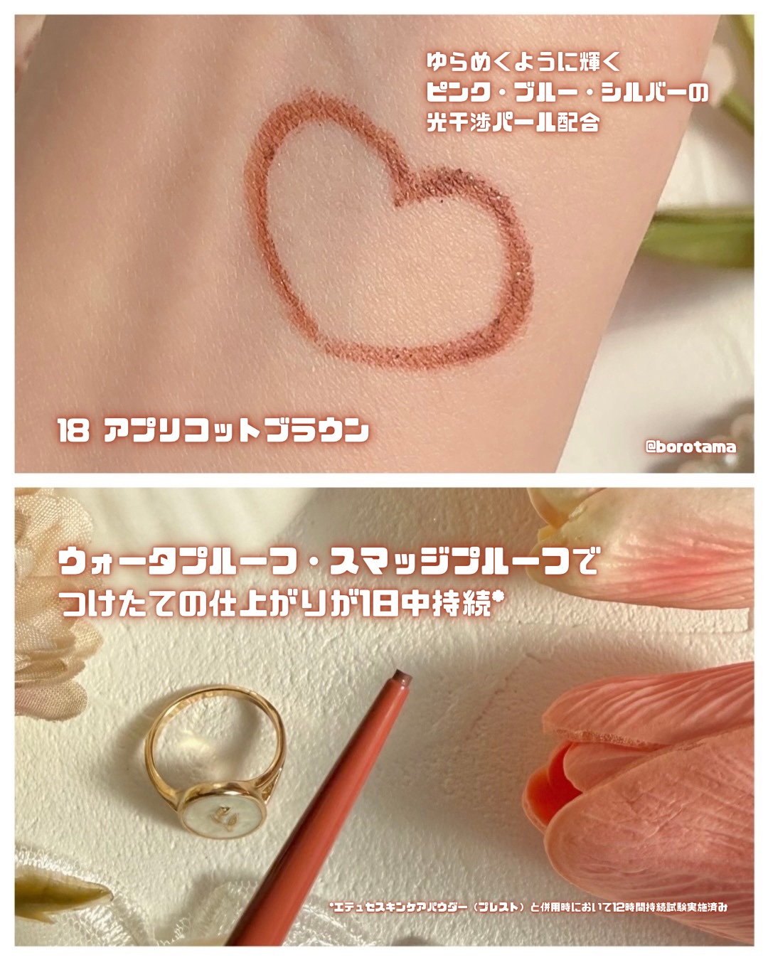 春の新色、どれもかわいくて、楽しみにしてた! 合わせて使ってみると、春らしい可愛らしいメイクになり、気分も上がったよ☺️🌸✨ ラメとマット、2つの質感で、肌になじみながらも目もとをナチュラルに大きく仕上げる。 絶妙なアプリコットカラーが可愛い🧡 透け感があるので肌の色になじみやすい。