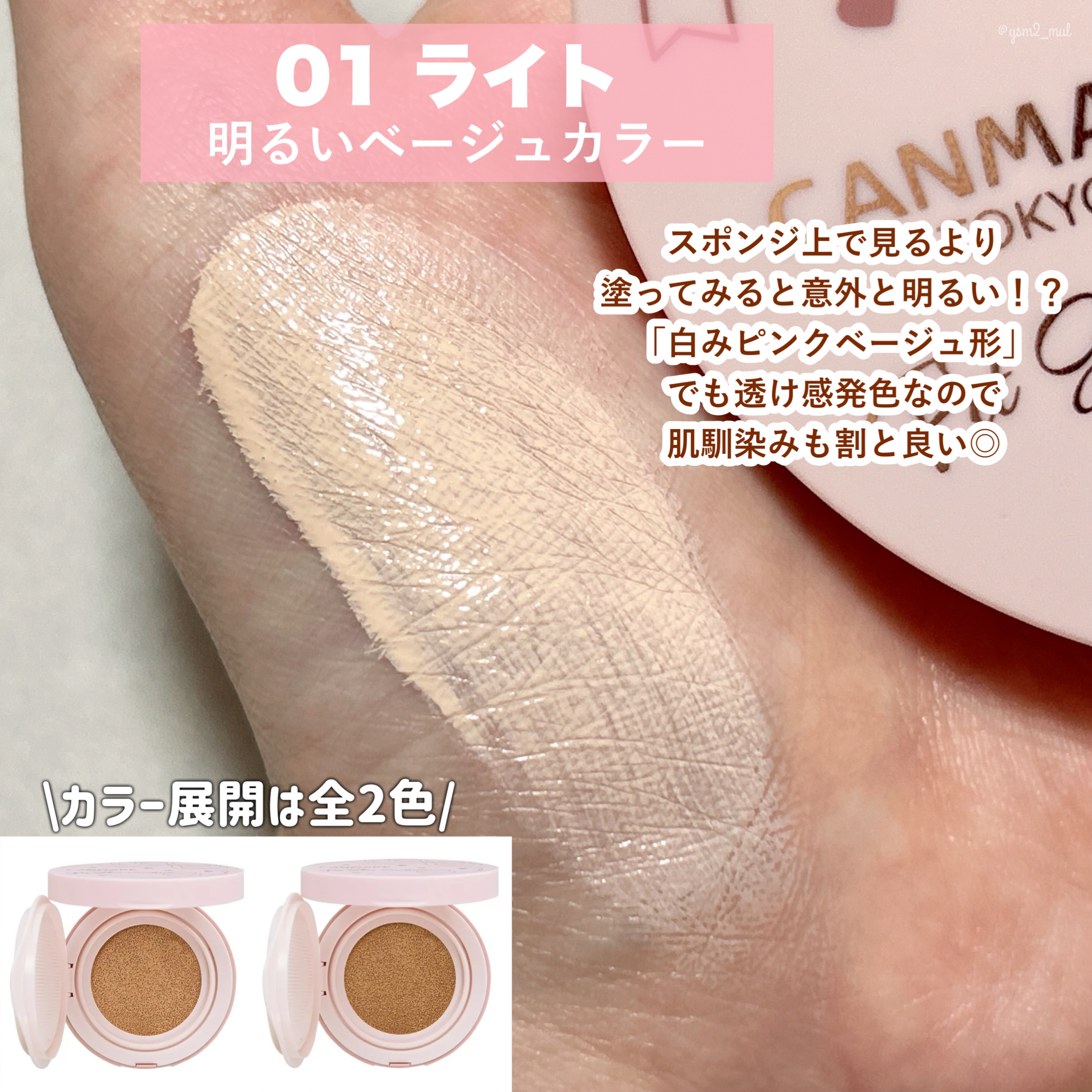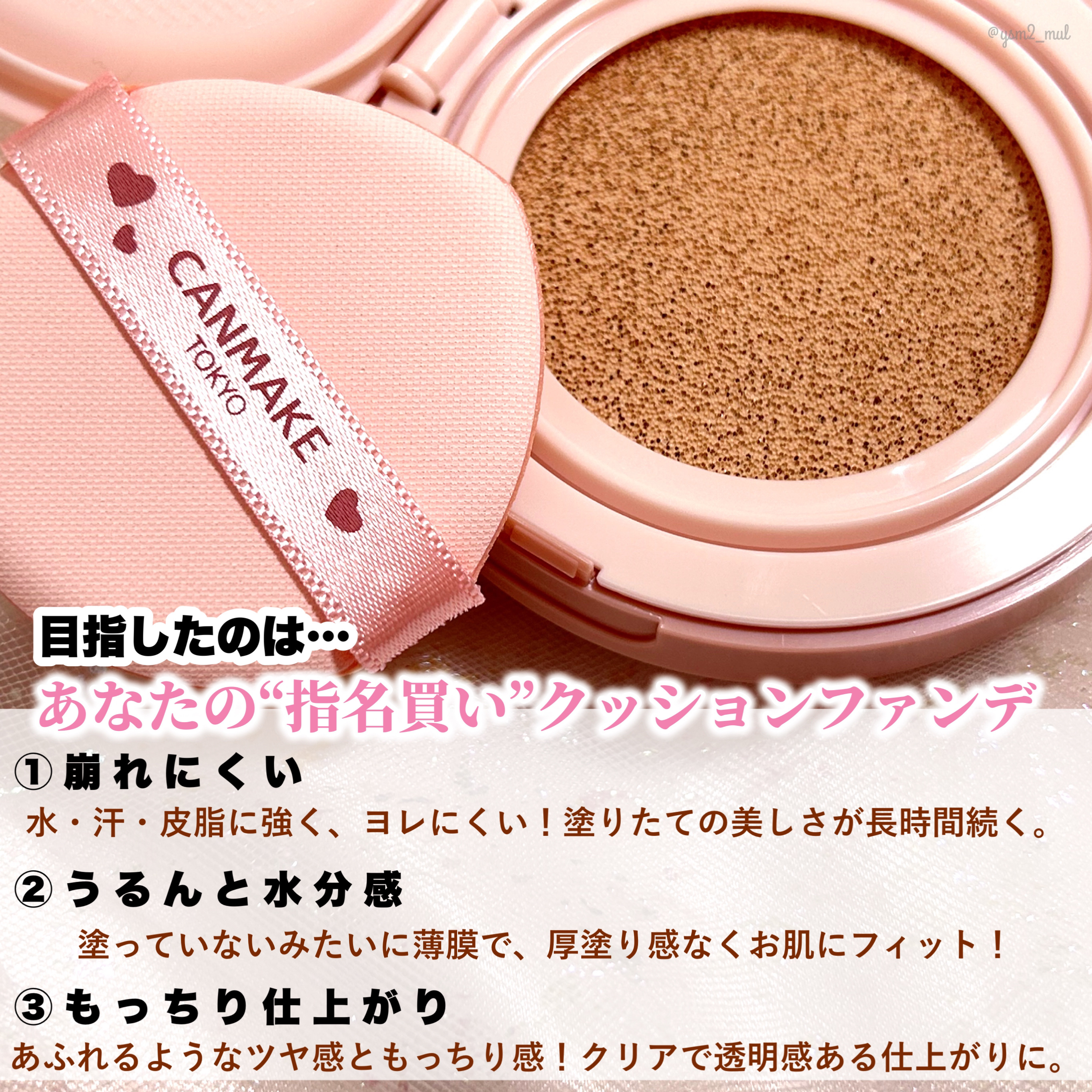 - ※2024年12月1日~PLAZAにて先行発売(一部店舗除く) ※全国発売は2025年2月下旬~/定番棚への導入:2025年4月以降順次(予定) 追求したのは、“薄膜×ツヤ×崩れにくさ” 透明つや肌仕上げの、うるんと水分感をまとう クッションファンデーション✨ キャンメイクから待望の クッションファンデーションが登場! 薄膜、ツヤ、崩れにくさのすべてを追求しました。 塗っていないみたいに薄膜で、ムラなくお肌にフィット! 厚塗り感のない、みずみずしく軽い付け心地。 水・汗・皮脂に強く、ヨレにくい! 塗りたてのキレイな仕上がりが続きます。 【11種の美容保湿成分配合】 6種のヒアルロン酸、セラミドNP、ナイアシンアミド、 レチノール、ツボクサエキス、マカデミア種子油