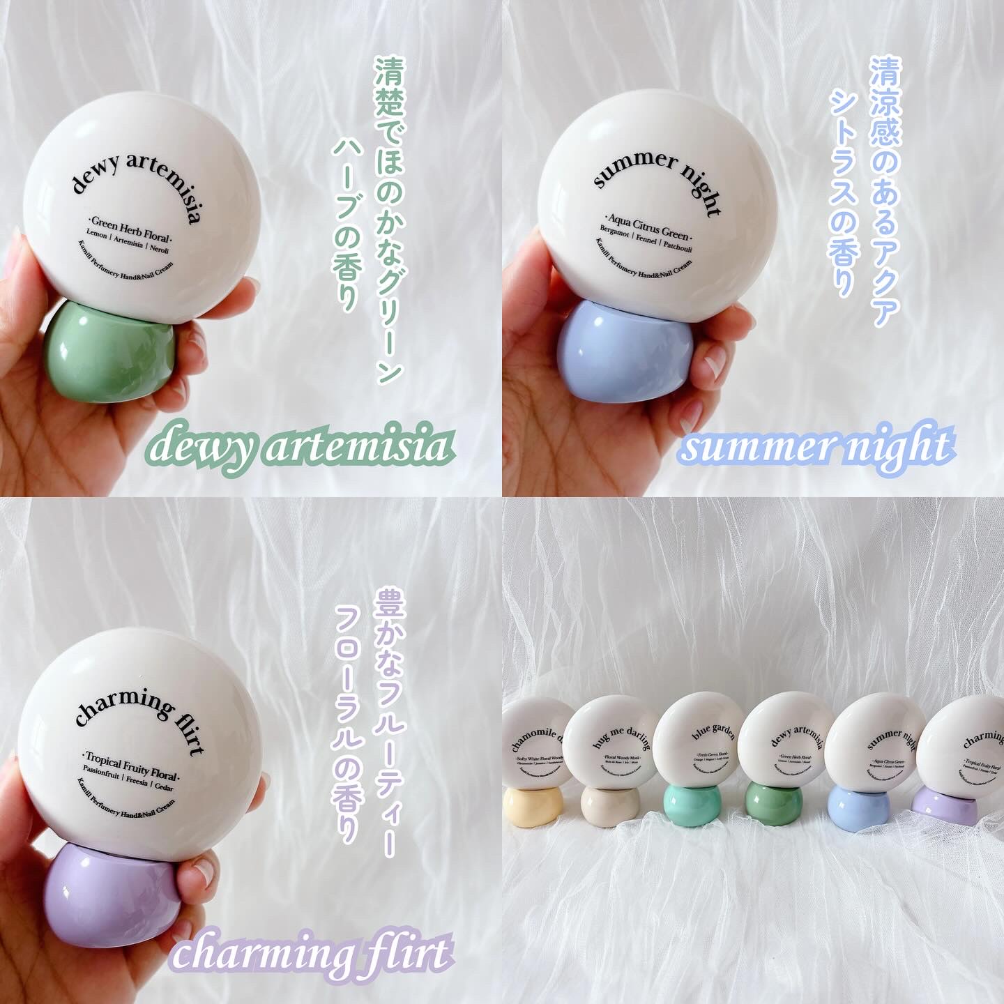 ユニークなオブジェパッケージと感性的な香りが特徴のハンドクリームです✨ 肌の保湿に優れたペプチド成分を配合し、肌を落ち着かせ保湿する6種類の植物性オイルも配合𓂃🫧 コロンとしたデザインが可愛く、香りもお気に入り😍❤️