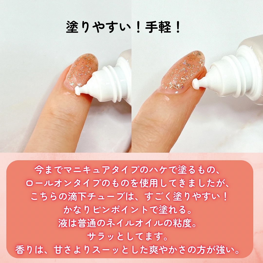 - 2023年12月下旬限定発売→2024年4月下旬以降順次定番化 爪・甘皮を保湿するフレグランスネイルオイル 滴下チューブのネイルオイルで1滴ずつ塗る量の調整ができます。 どこでも気軽に塗れるポケットサイズです。 高保湿はオイルが爪・甘皮にうるおい・ツヤを与え、乾燥を防ぎます。 べたつきにくいサラッとしたテクスチャーです。 トリートメント成分として、6種の植物オイル(ホホバ種子油、バオバブ種子油、アーモンド油、オリーブ果実油、ツバキ種子油、ヒマワリ種子油)を配合。 爪を健やかに保つ成分として、ケラチン(イソステアロイル加水分解ケラチン(羊毛))を配合。 白桃烏龍茶の香り TOP:ピーチ・レモン・ライチ MIDDLE:烏龍茶・ローズ・ゼラニウム・ジャスミン LAST:ムスク