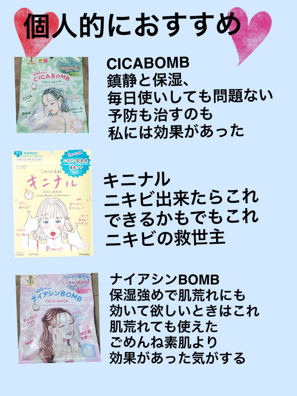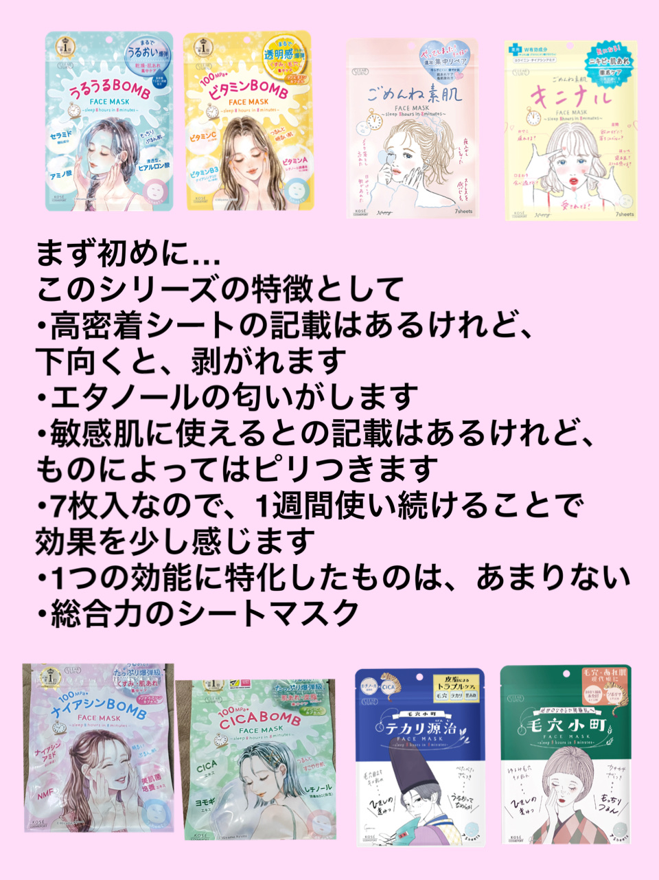 全部のシリーズ匂いが気になった。 肌が良くなったっていう実感はなかった。 前までは好きなシートマスクでどれも好きだったんですが、改めて検証比較して、私はリピなしかなーと思いました。